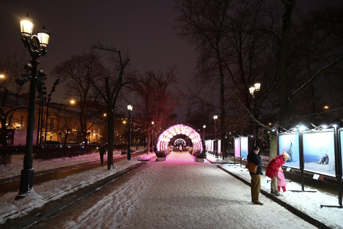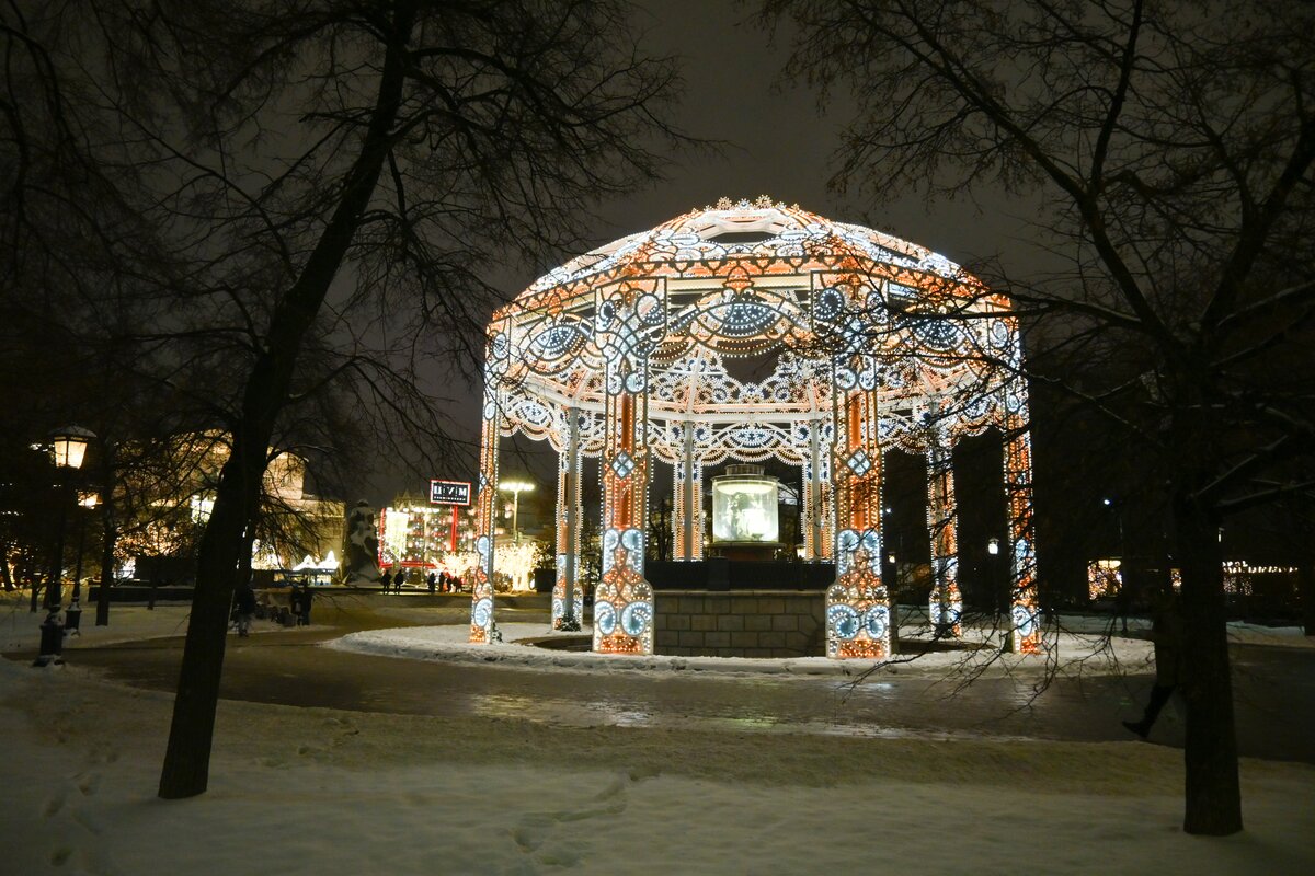 Около Триумфальной арки появились световые фигуры главных зимних героев – Деда Мороза и Снегурочки. На ВДНХ и в Парке Горького установили декоративные украшения около центральных входов и на всех аллеях. А в парке Северного речного вокзала поставили гигантскую новогоднюю ель, световые шары и цифры, от которых по аллеям разлетаются теплые золотистые лучи.