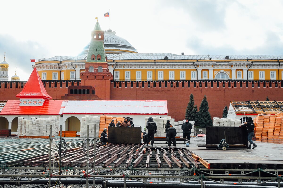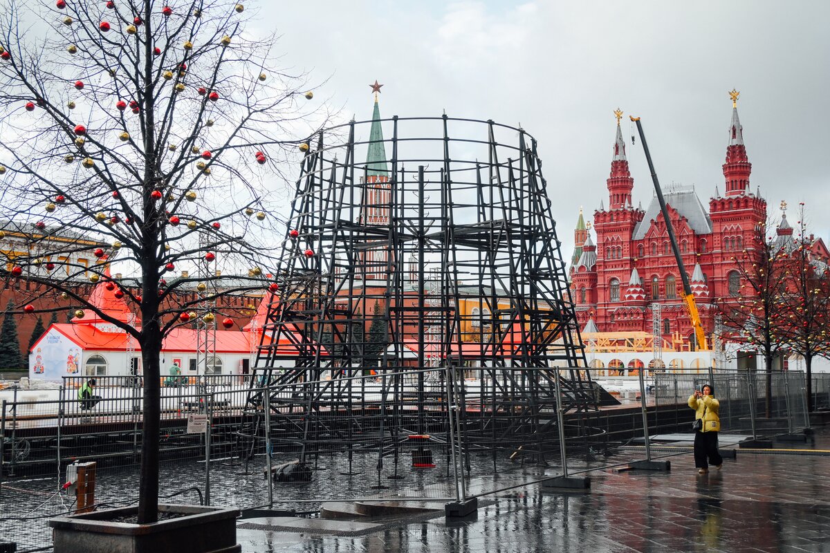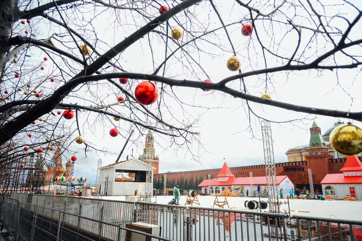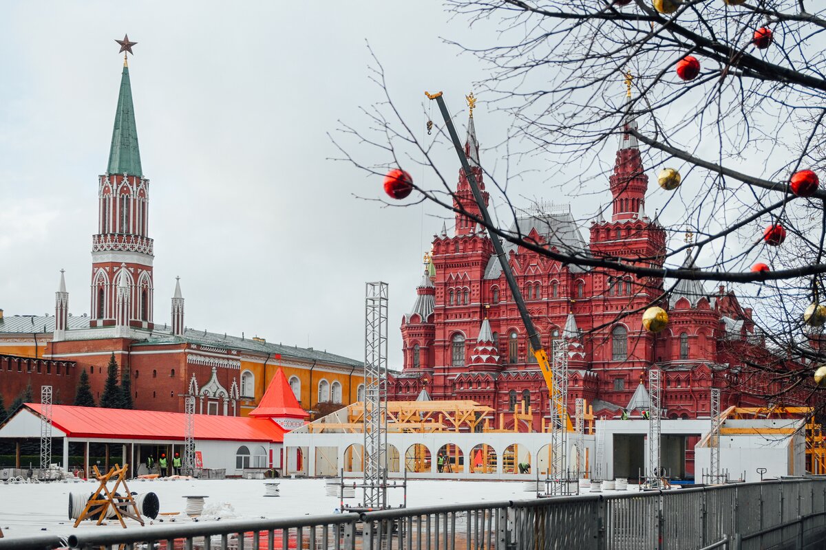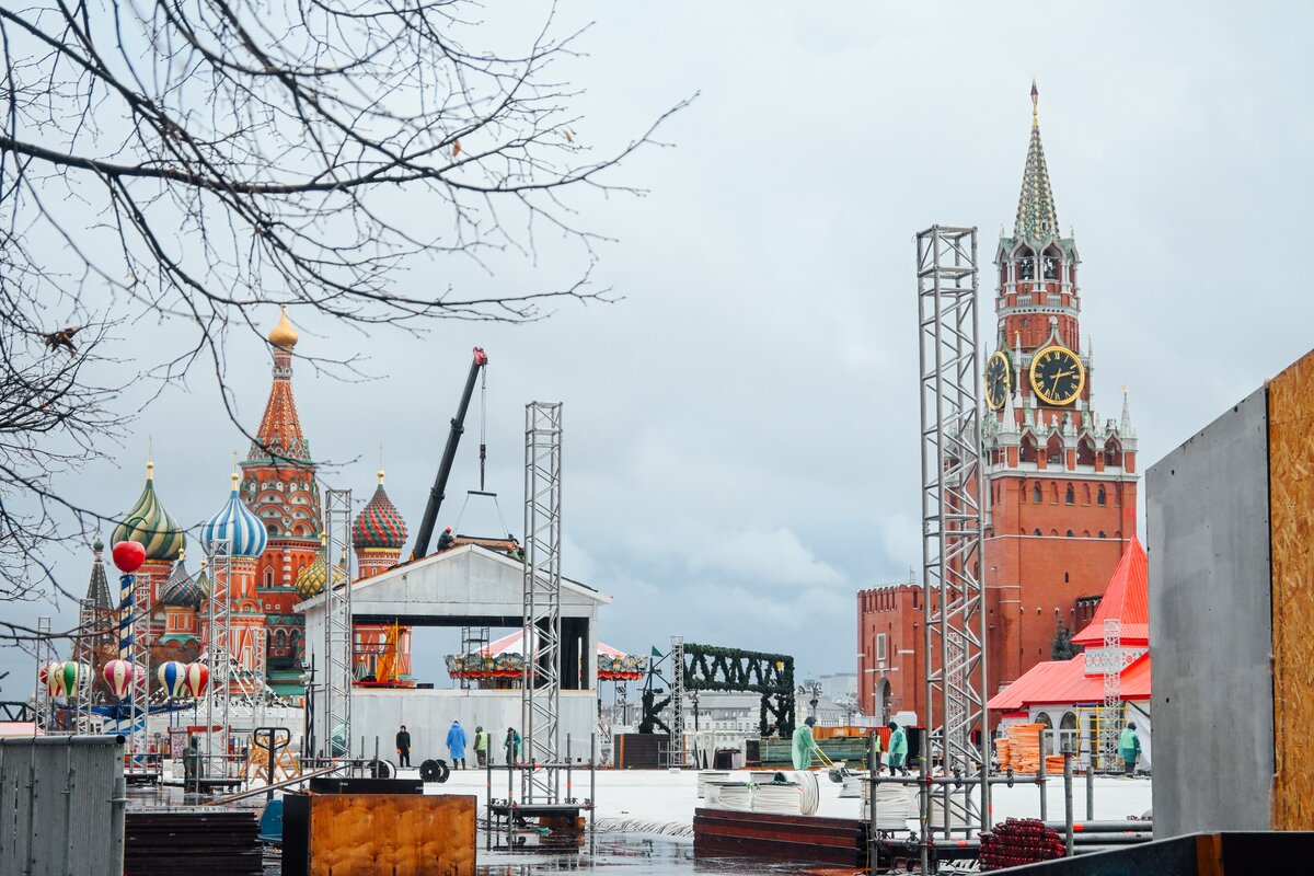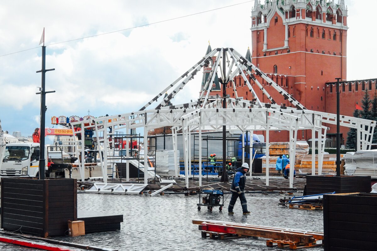 На Красной площади близится к завершению установка сезонного ГУМ-Катка. Ледовое покрытие протянется от Никольской башни до Мавзолея Ленина, заняв около двух третей площади.