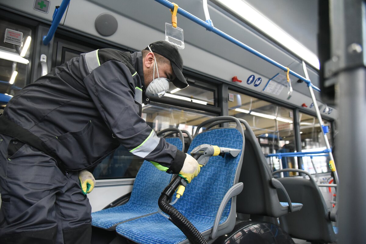 Столичные автобусы массово дезинфицируют в качестве меры профилактики распространения коронавируса COVID-19 и иных вирусных заболеваний. Общественный транспорт обрабатывают специальным раствором на основе антисептика.