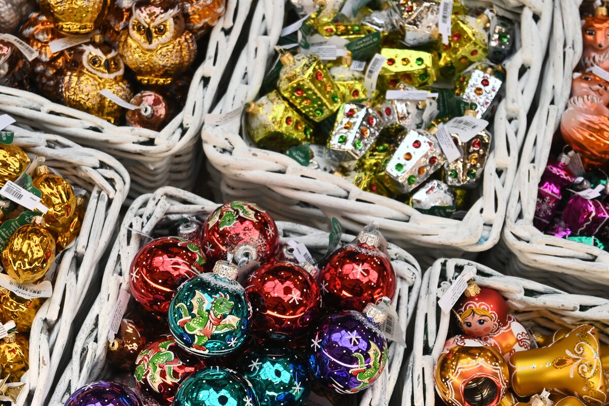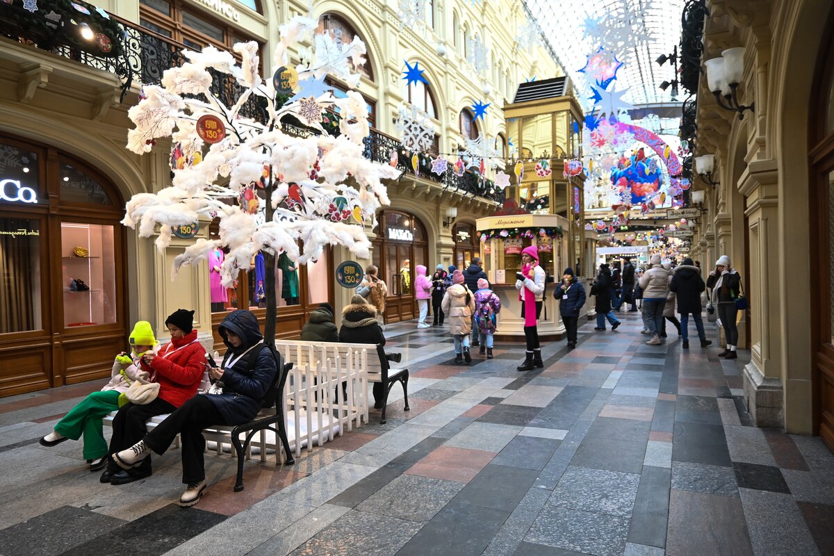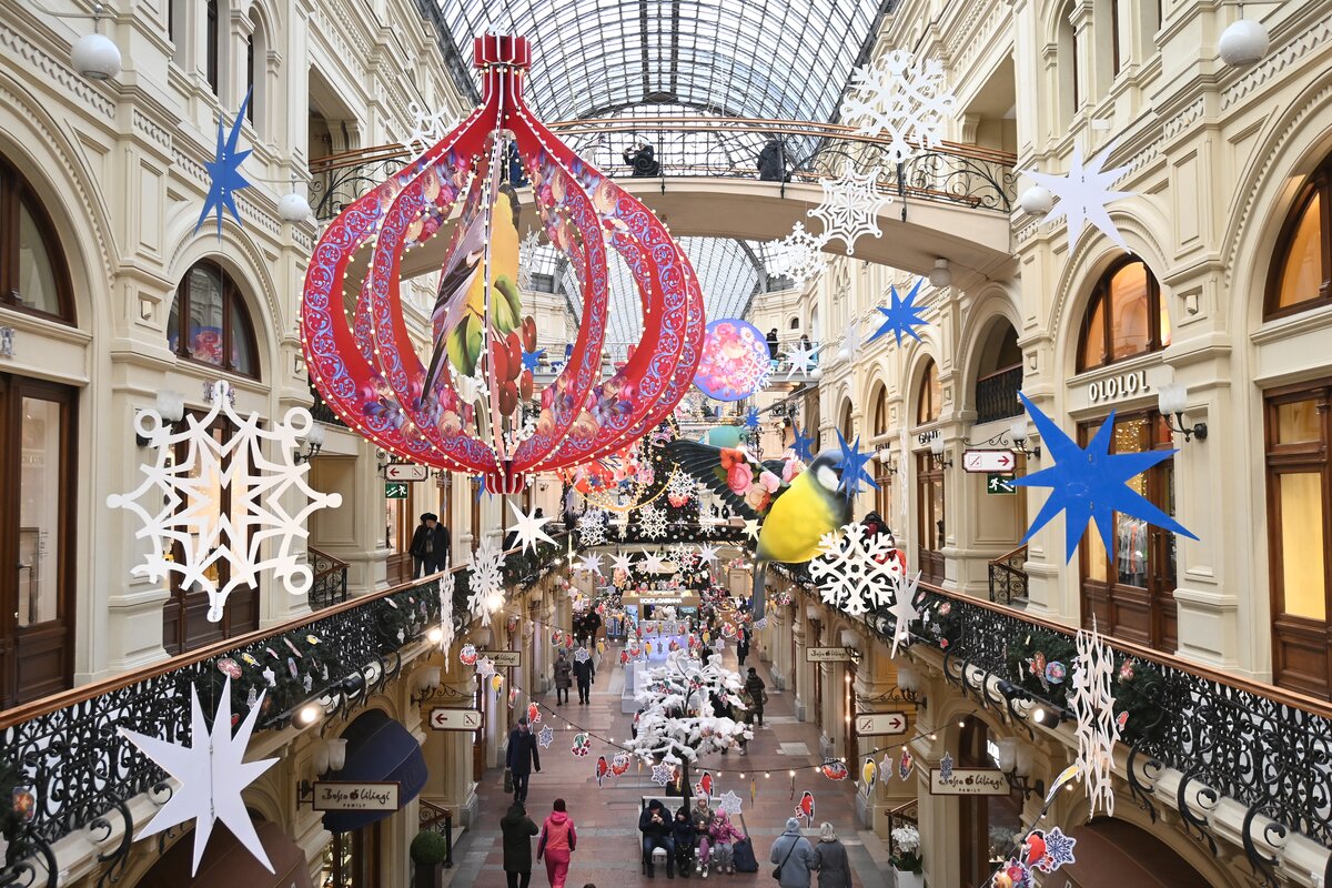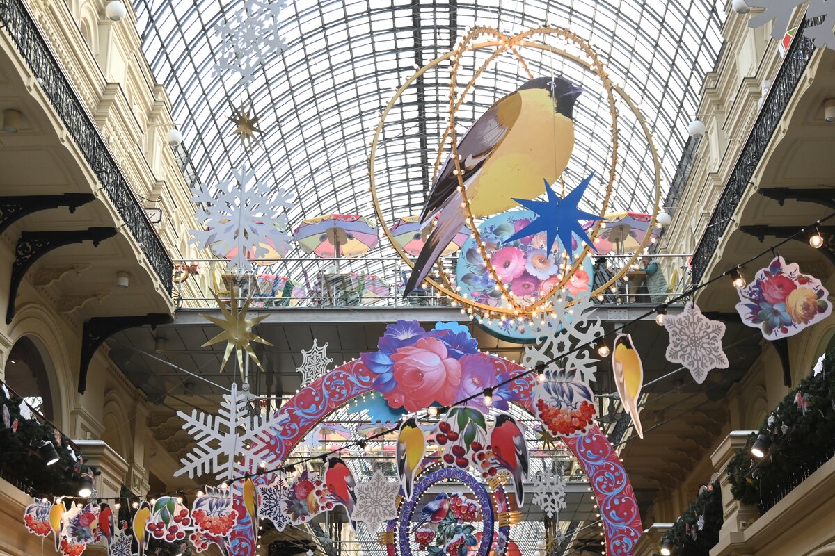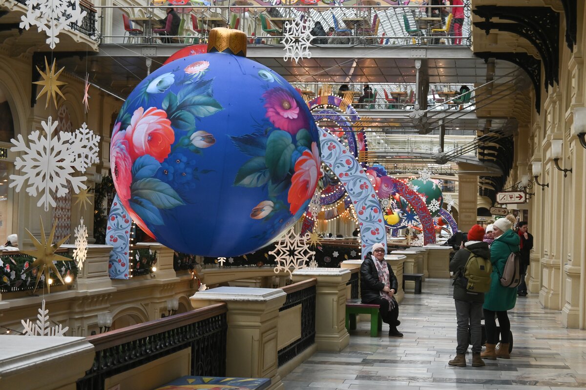 ГУМ к новогодним праздникам всегда ярко украшают гирляндами, елками и шарами. Здесь можно и полюбоваться декорациями, и погреться после прогулки на Красной площади.