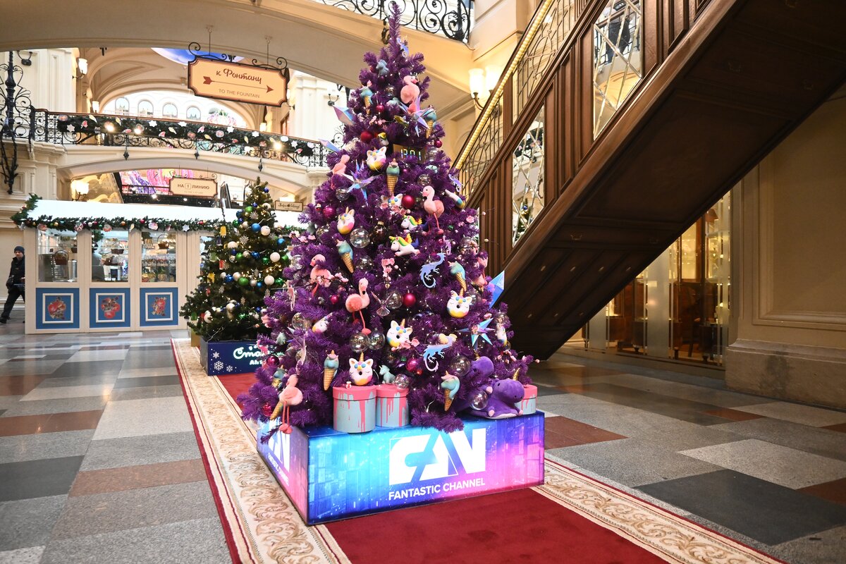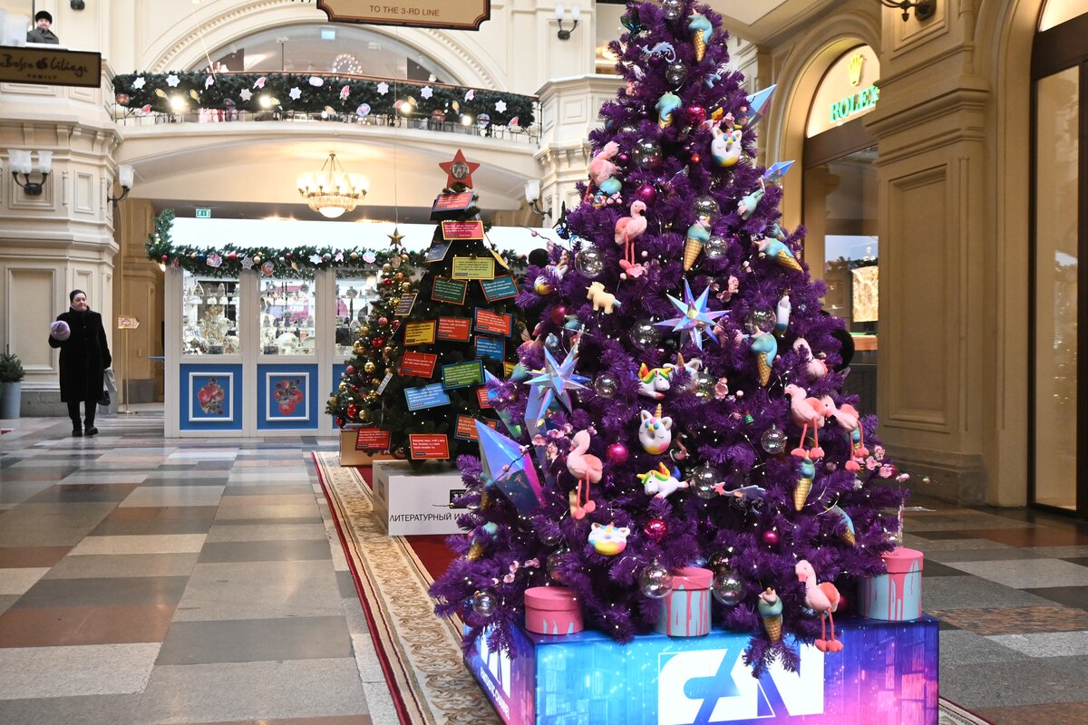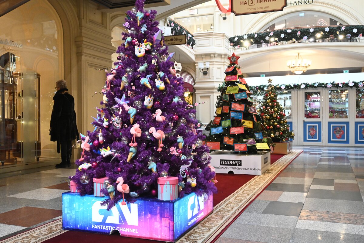 В Москве открылась ежегодная выставка "Новогодние елки в ГУМе на Красной площади", на которой можно увидеть оригинальные и концептуальные символы Нового года, и нестандартно оформленные елки.