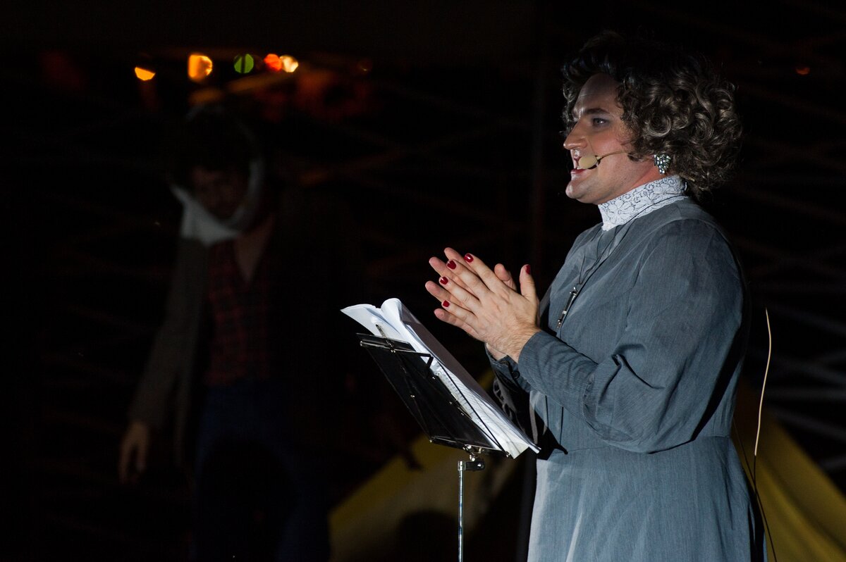 Sing-a-long — это интерактивное костюмированное представление, в котором зрители смотрят кино не в тишине, а напротив, танцуют и подпевают песням из саундтрека вместе с актерами, подглядывая слова на бегущей строке экрана. Постановщиком действа выступил театральный режиссер Юрий Квятковский при актерской поддержке "Мастерской Дмитрия Брусникина".