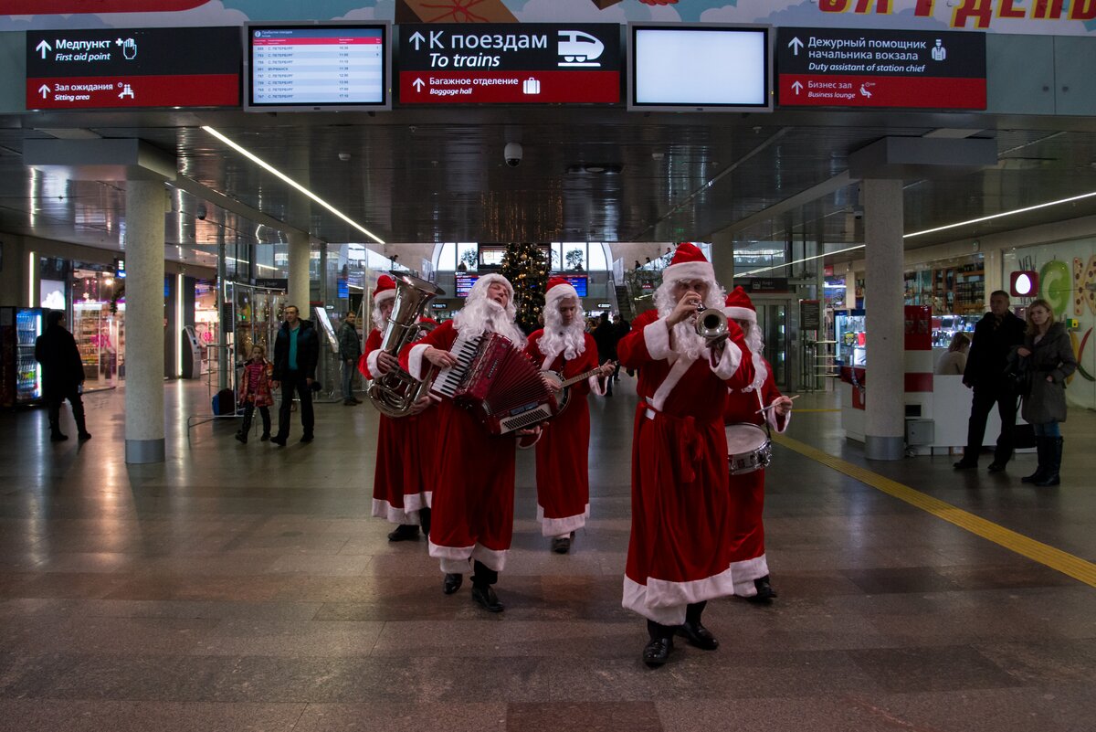 На Ленинградском, Ярославском и Курском вокзалах 25 декабря выступил оркестр Дедов Морозов. Коллектив играл бесплатно в рамках проекта "Музыка на вокзалах". А 30 декабря профессиональные музыканты, одетые в костюмы Дедов Морозов, выступят на Киевском, Павелецком и Белорусском вокзалах. Оркестр исполнит новогодние и рождественские мелодии, музыку из популярных кинофильмов.