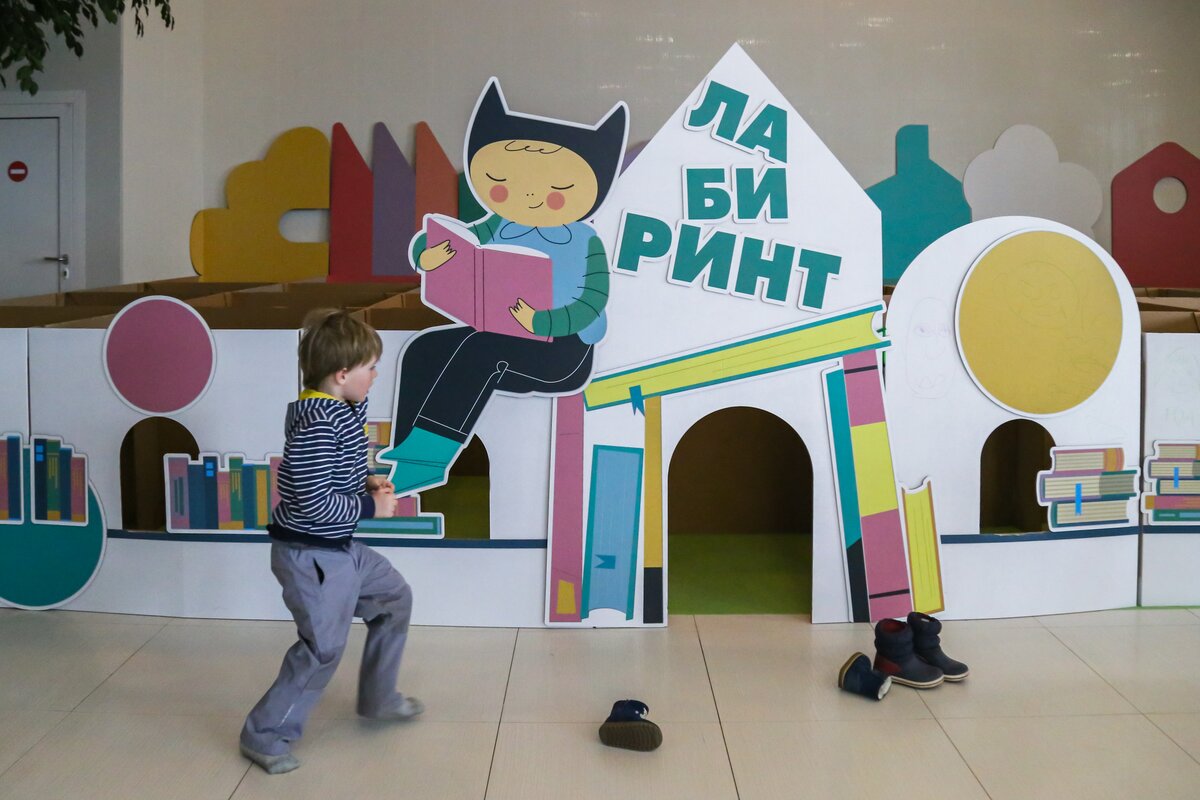 Пространство второго этажа Москвариума превратилось в волшебный мир детской книги, в котором разместилось несколько тематических зон: две зоны мастер-классов – для детей младшего возраста и юных гостей постарше, Читальня, Сцена и Картонный лабиринт.