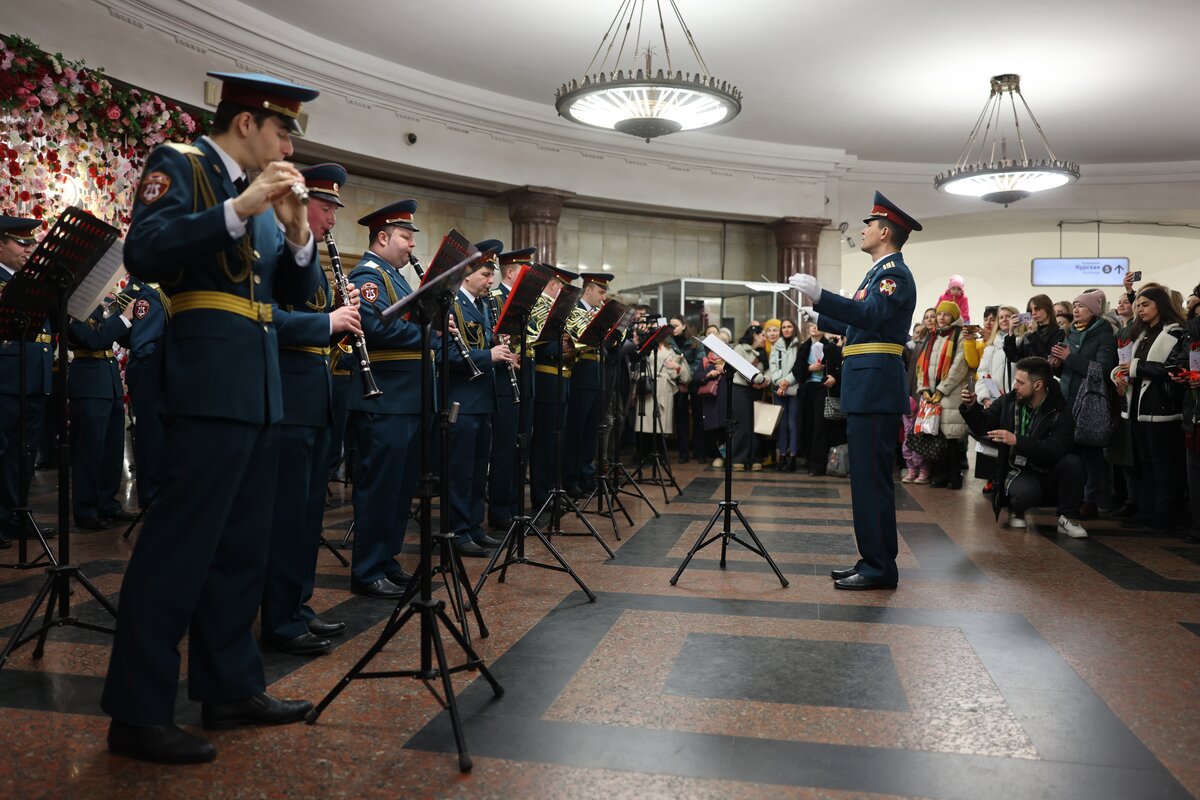 Оркестр Центрального округа войск национальной гвардии устроил концерт на станции "Курская" 8 марта. Музыканты играли вместе с флейтовым квартетом. Подобные мероприятия совместно с Московским транспортом уже стали доброй традицией.