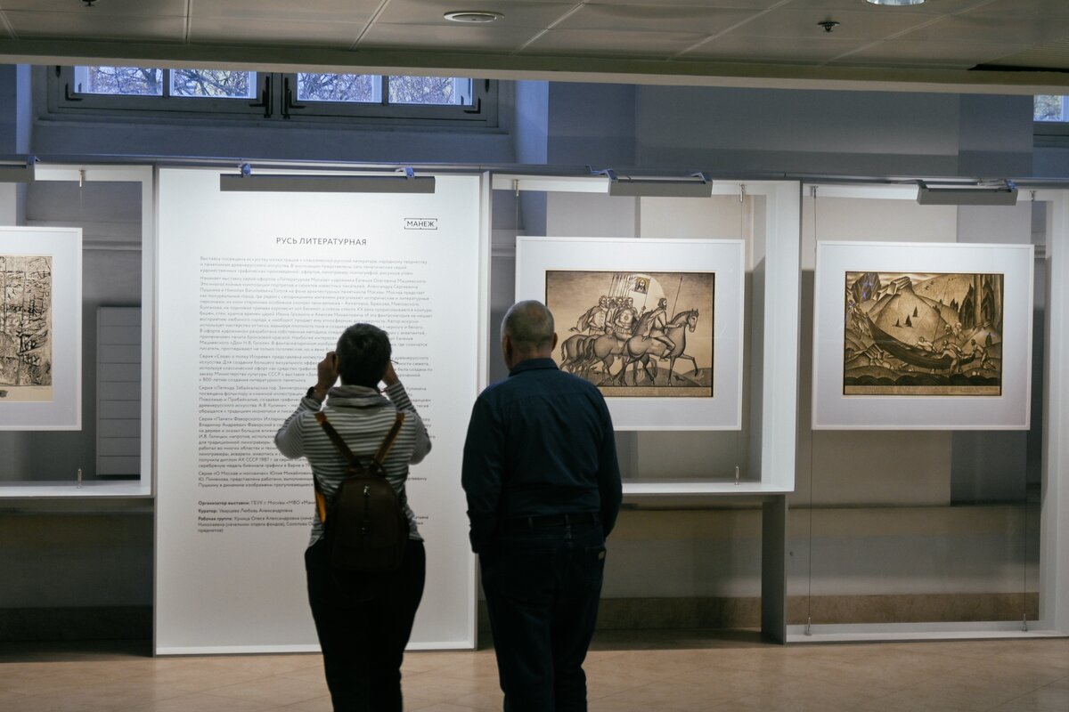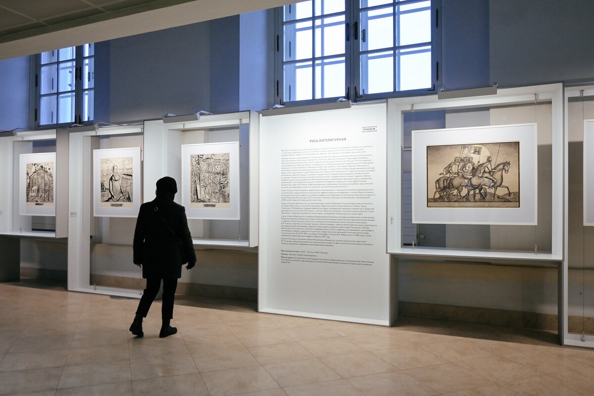 Выставка живописи "Русь литературная" проходит в "Манеже" с 8 по 28 ноября. Она посвящена искусству иллюстрации к классической русской литературе, народному творчеству и памятникам древнерусского искусства. В экспозиции представлено пять тематических серий художественных графических произведений.