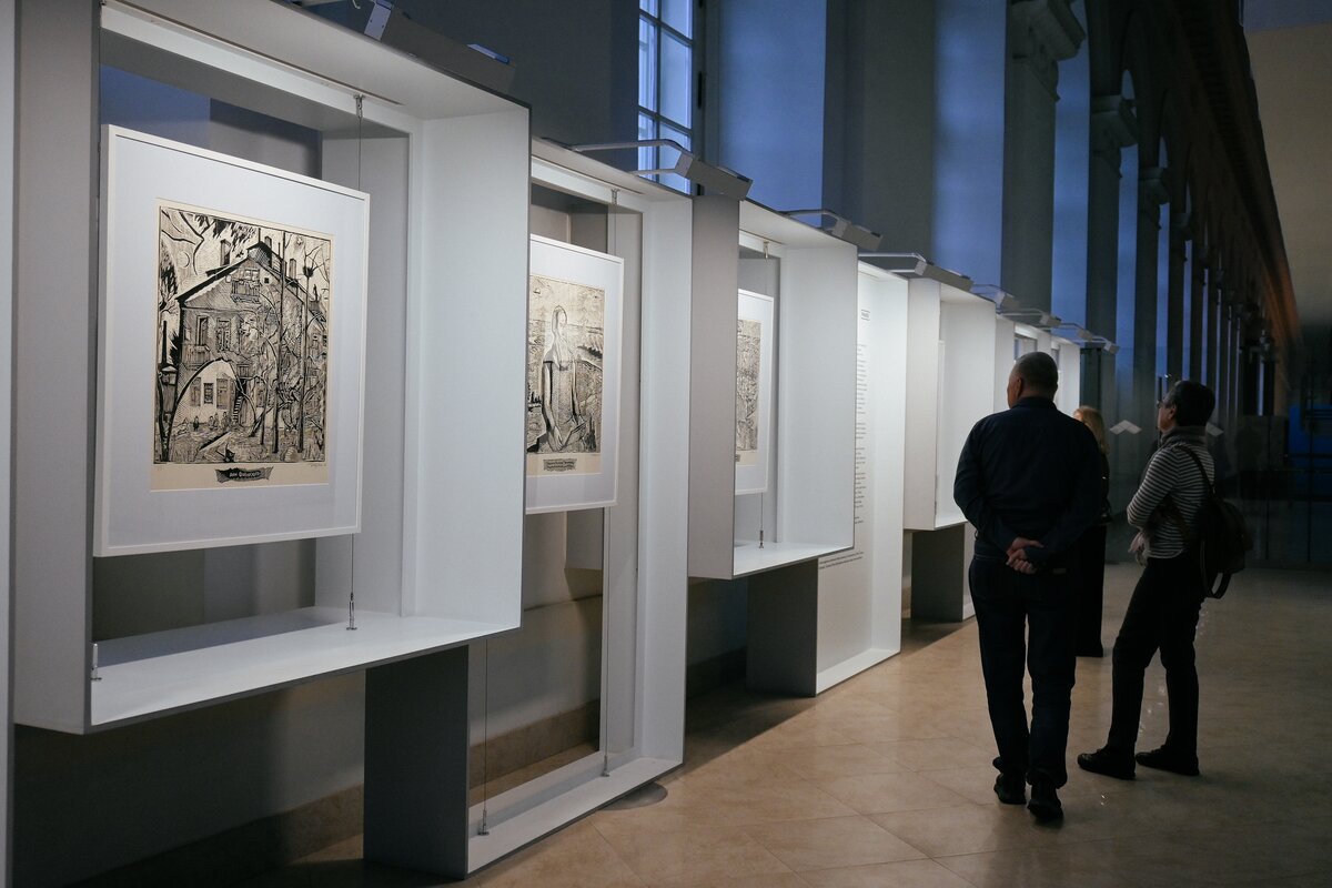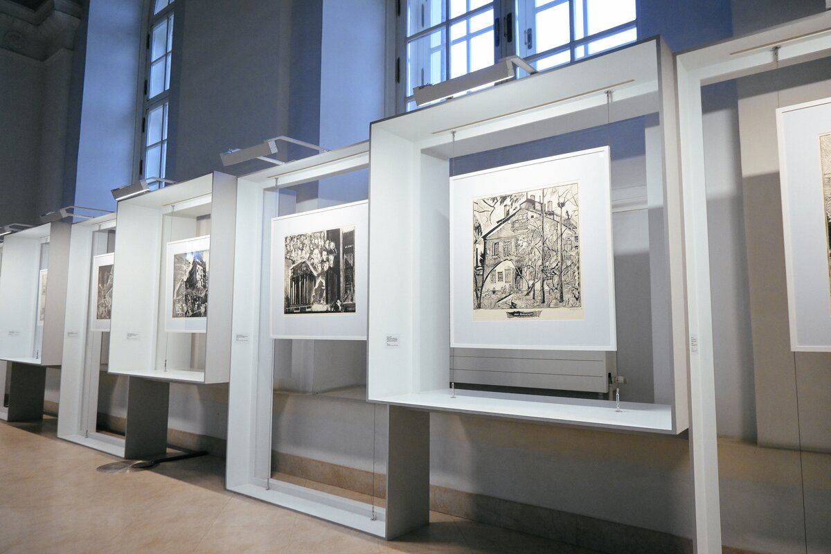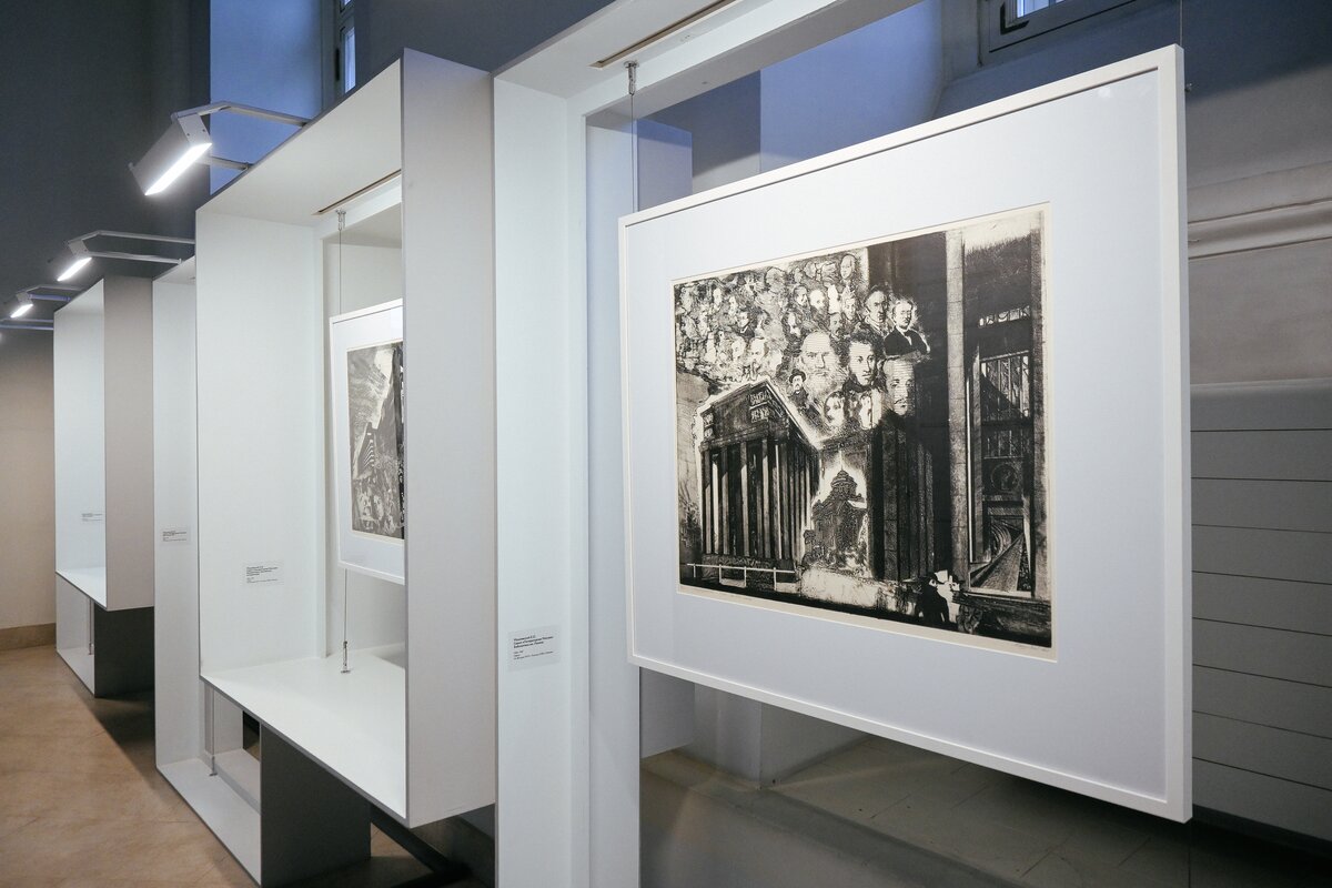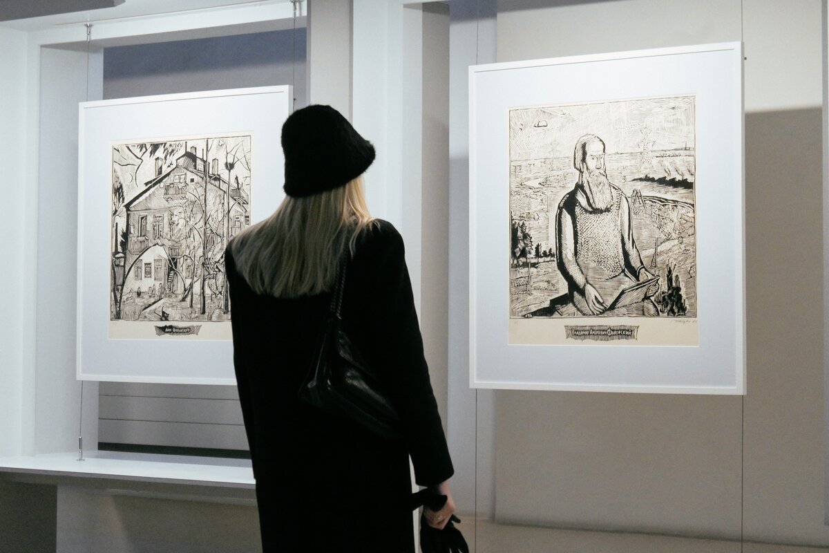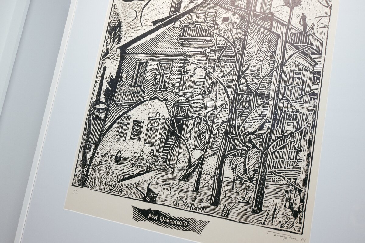 Экспозиция "О Москве и москвичах" Юлия Вечерского выполнена тушью, а работы на тему "Памяти Фаворского" Иллариона Голицына посвящены известному иллюстратору Владимиру Фаворскому, который использовал классическую черно-штриховую гравюру на дереве.