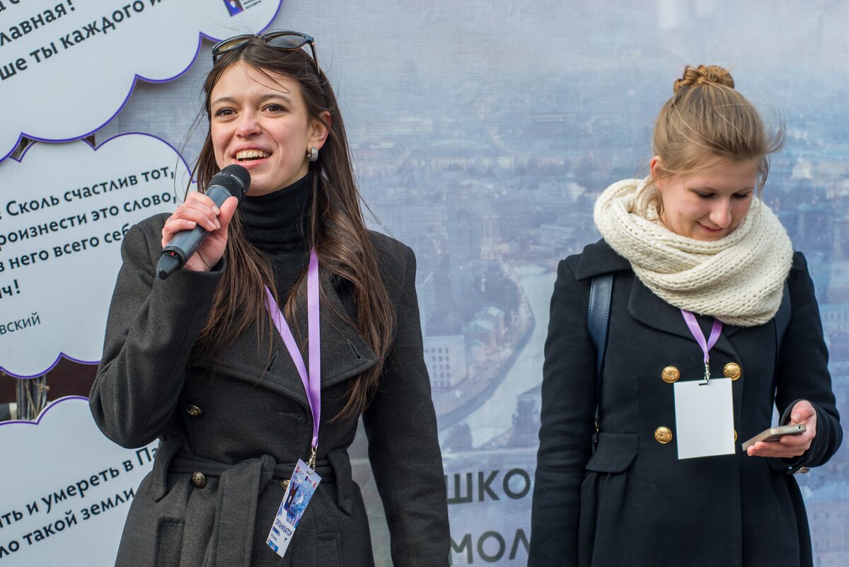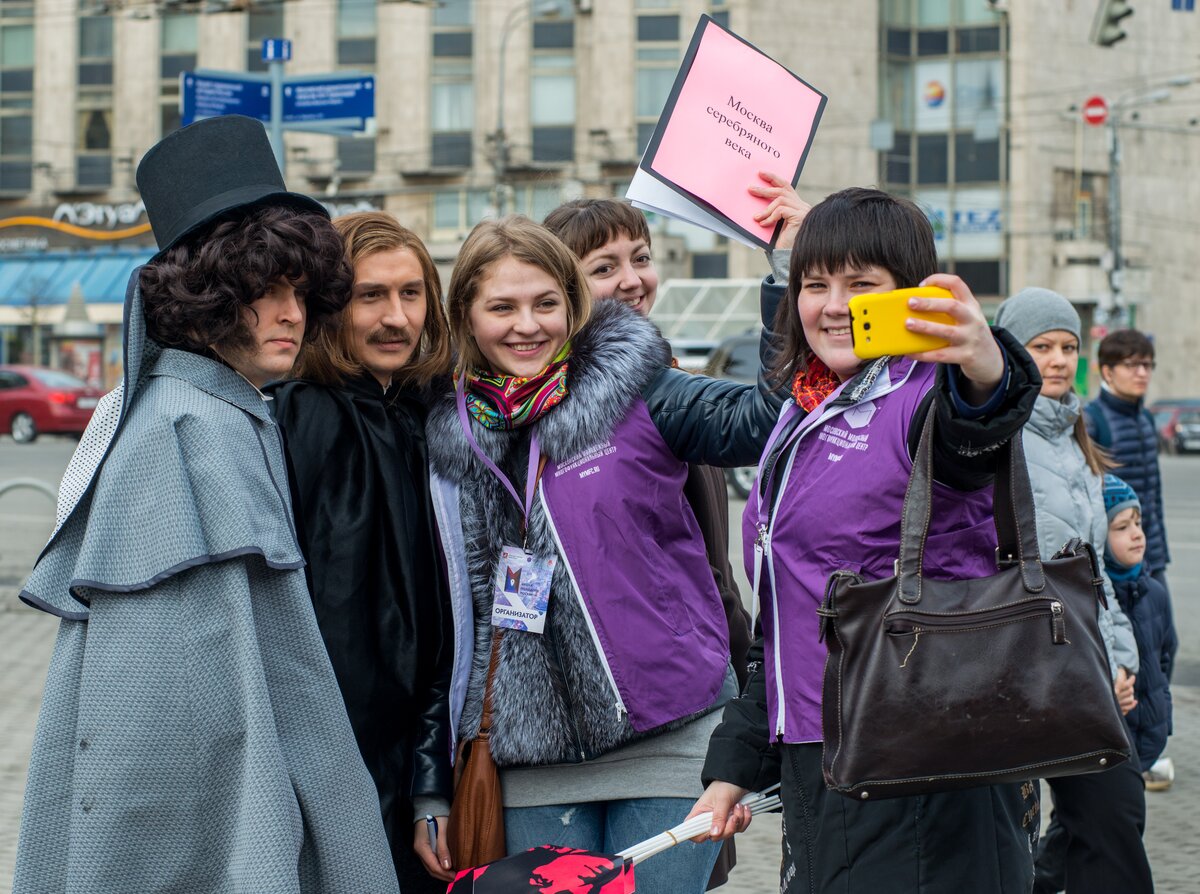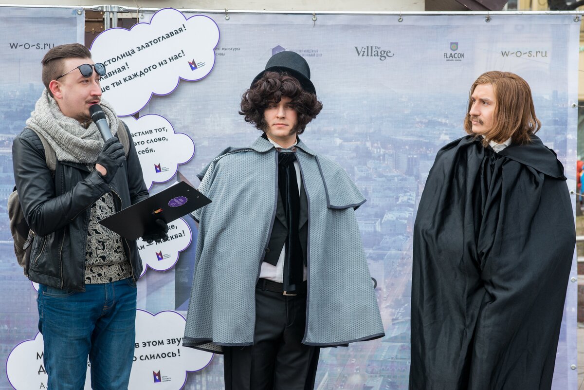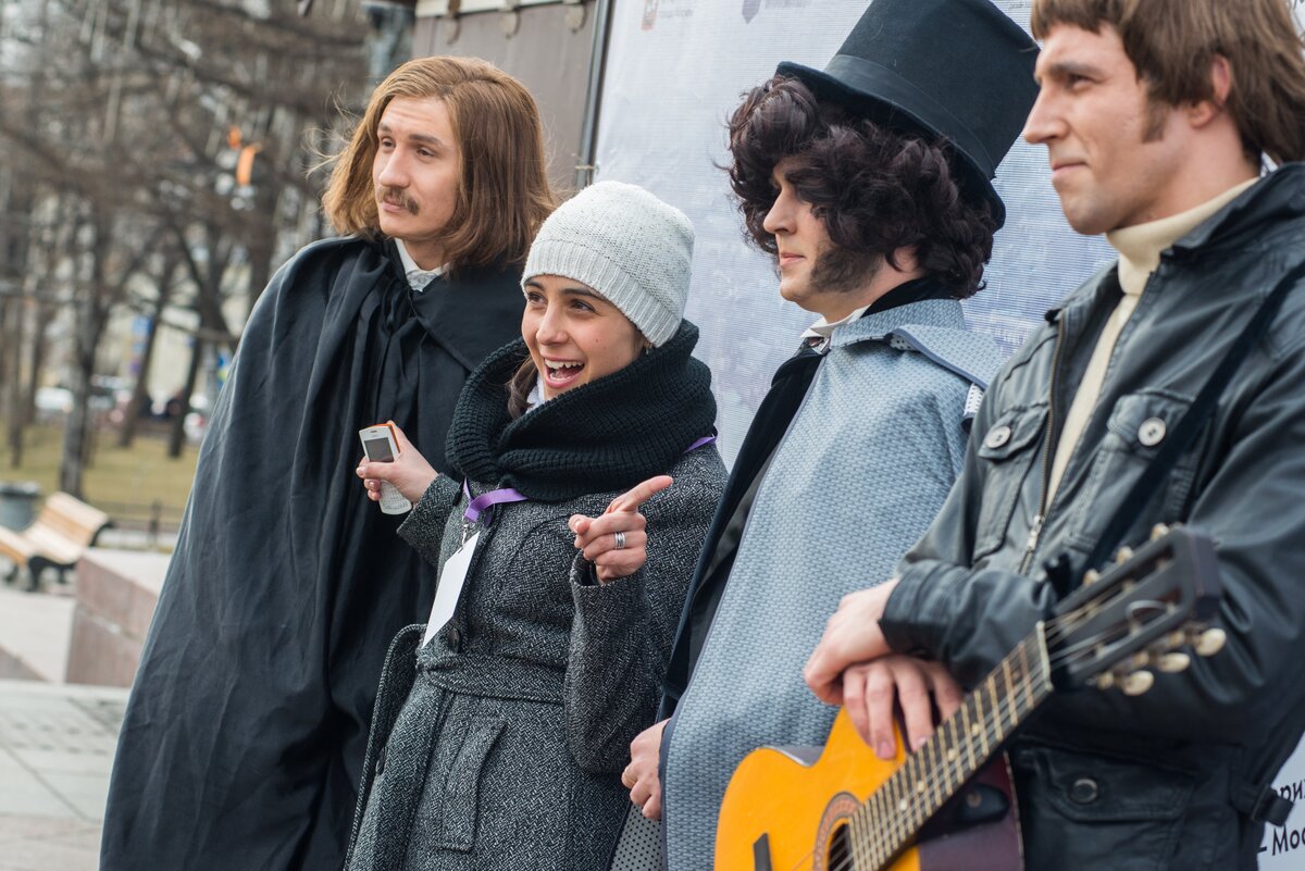 28 марта в Новопушкинском сквере одновременно стартовали пять экскурсий "Литературные прогулки" в сопровождении актеров, переодетых в русских писателей. Организатором стала Школа молодого москвича, мероприятие приурочили к Году литературы.