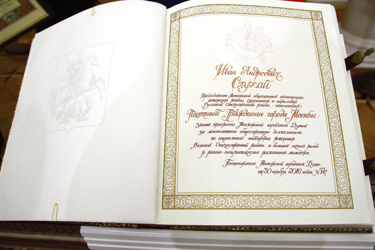 Сергей Собянин наградил председателя Московской общественной организации ветеранов войны Ивана Слухая званием "Почетный гражданин города Москвы".