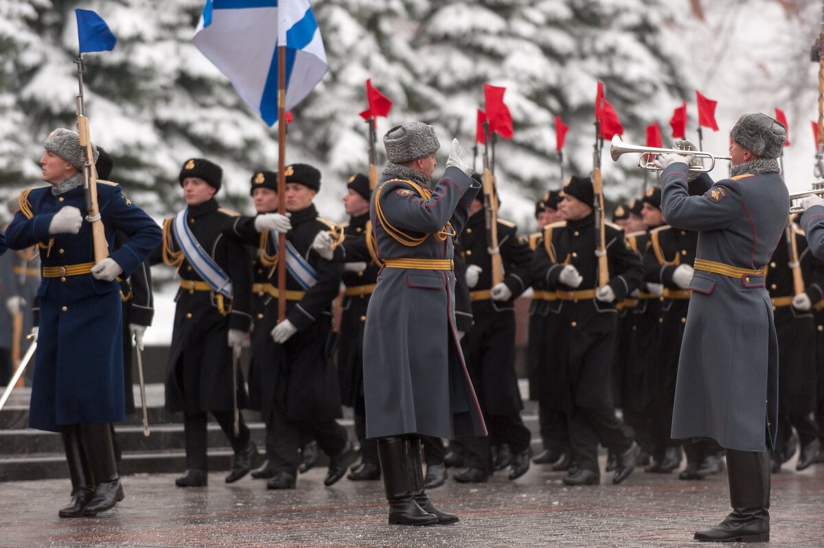 До начала парада военнослужащие вынесли четыре венка из еловых ветвей, белых хризантем и красных гвоздик. Зазвучал метроном и присутствовавшие почтили память погибших минутой молчания. После заиграл гимн Российской Федерации.