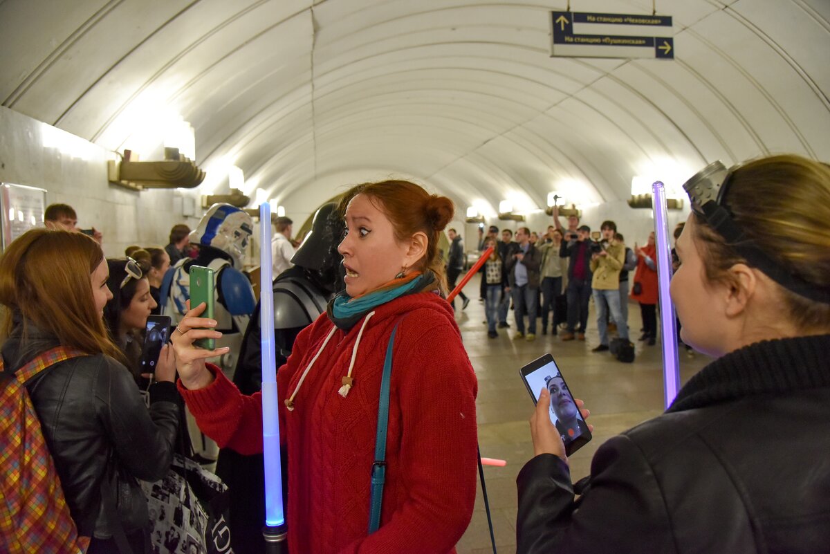На станции "Пушкинская" они встретились с принцессой Леей. Там же оркестр исполнил Имперский марш.