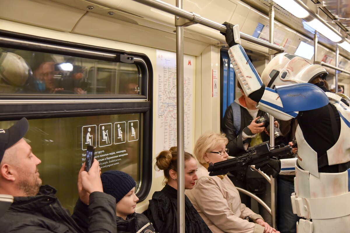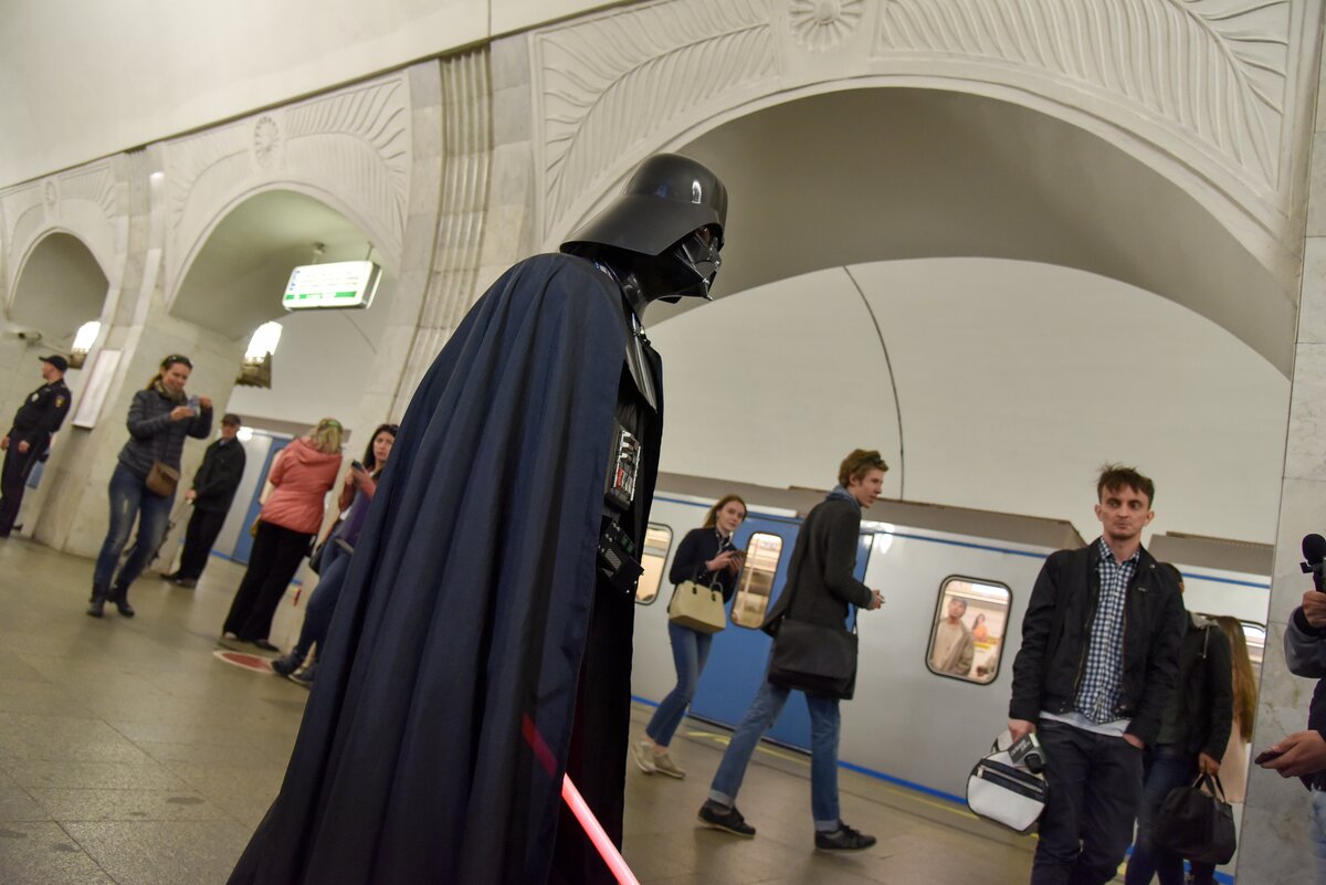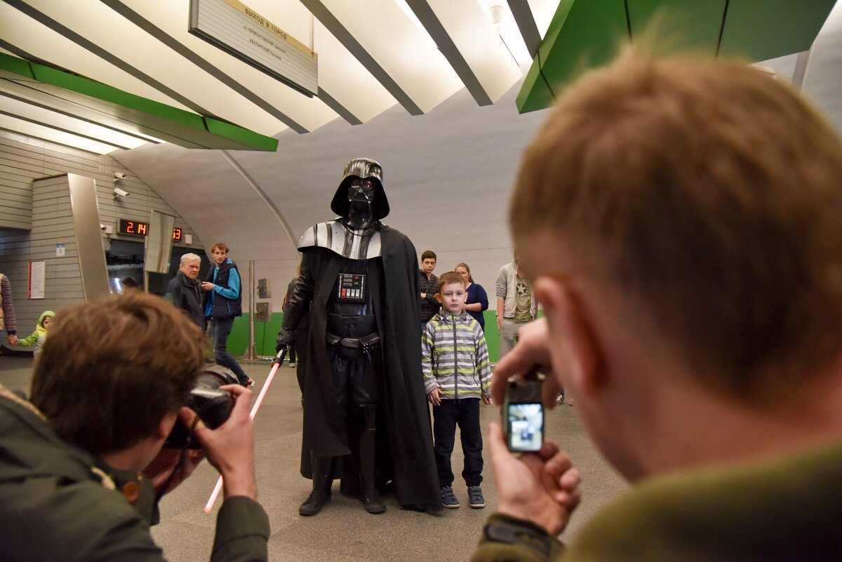 Столичный метрополитен отпраздновал 4 мая день "Звездных войн". Дарт Вейдер и штурмовик проехались в вагоне метро, попытались переманить пассажиров на сторону тьмы, устроили бой на световых мечах и уступили место бабушкам.