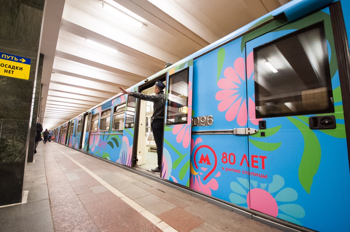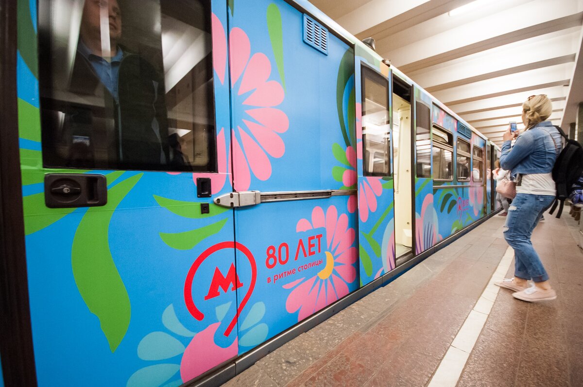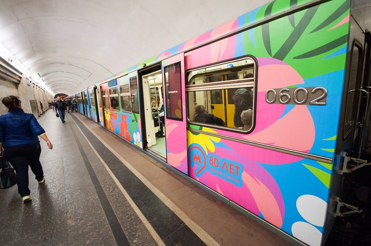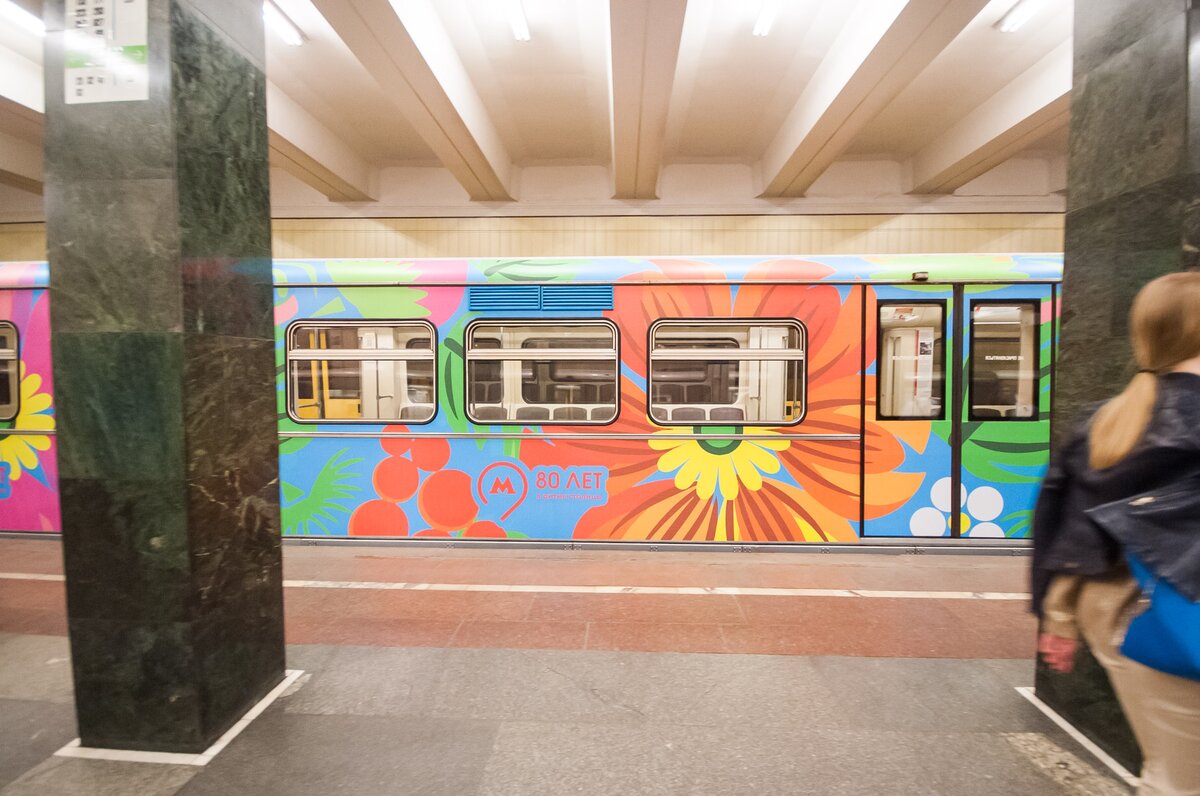На Арбатско-Покровской линии запустили поезд, оформленный по эскизу пассажира, победившего в конкурсе "Краски метро". Его проводили в честь 80-летия Московского метрополитена.