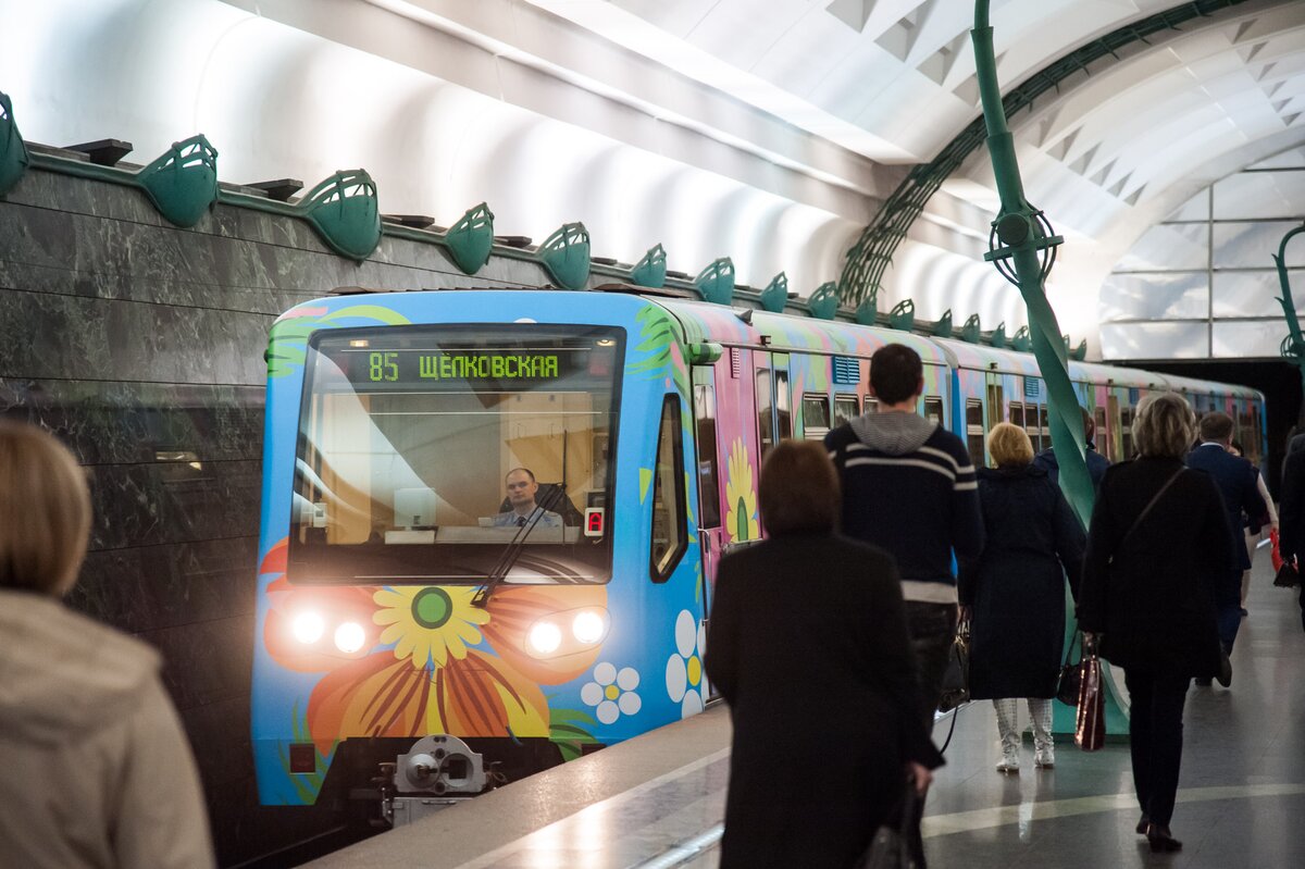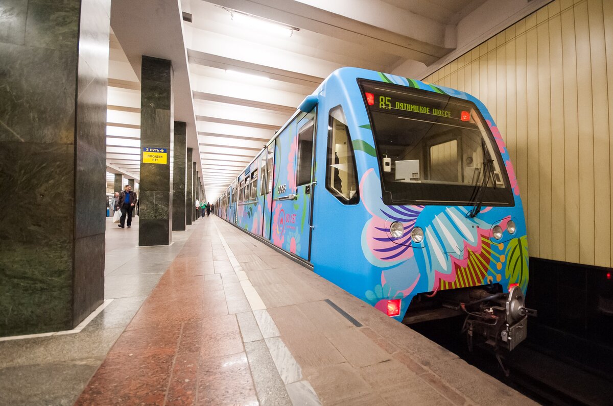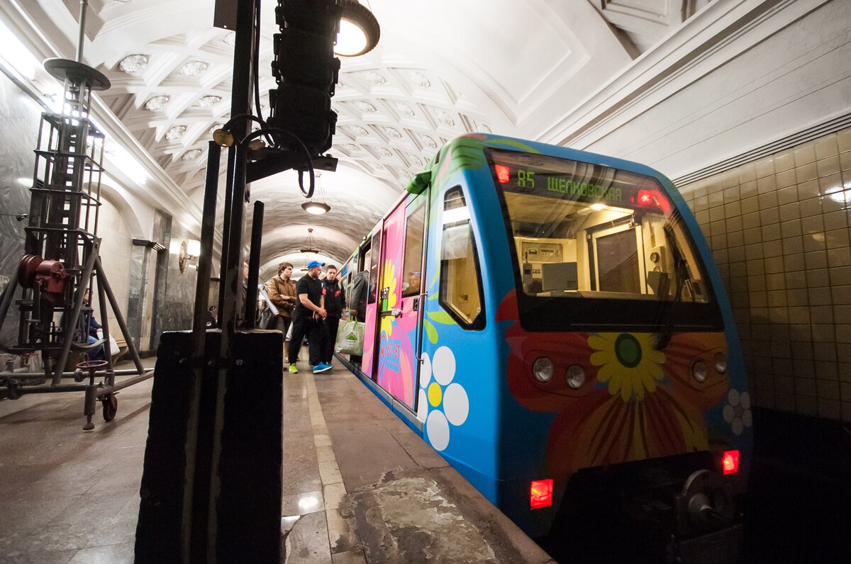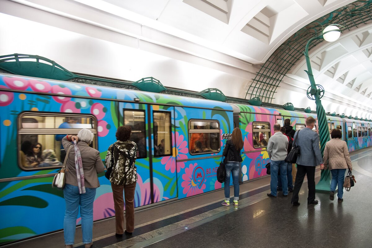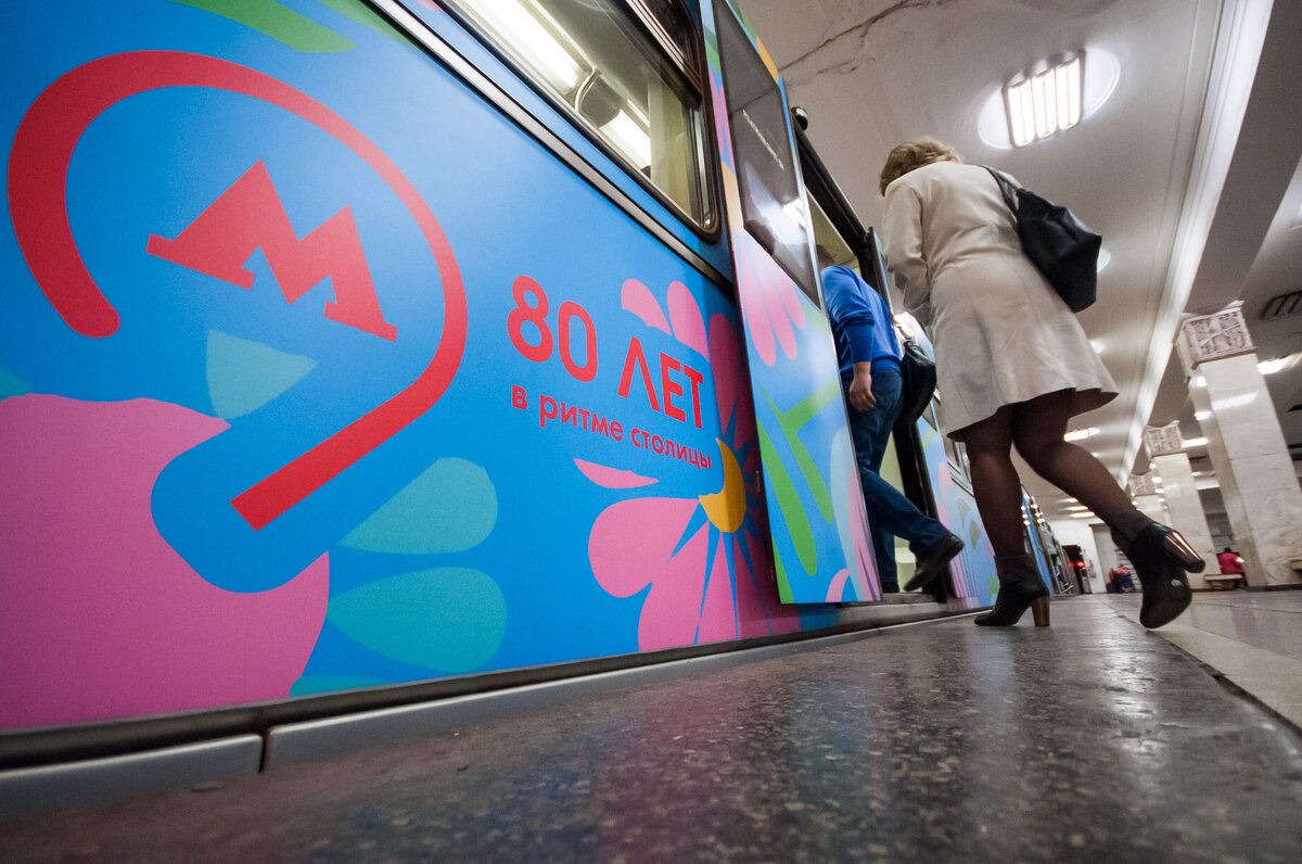 На Арбатско-Покровской линии запустили поезд, оформленный по эскизу пассажира, победившего в конкурсе "Краски метро". Его проводили в честь 80-летия Московского метрополитена.