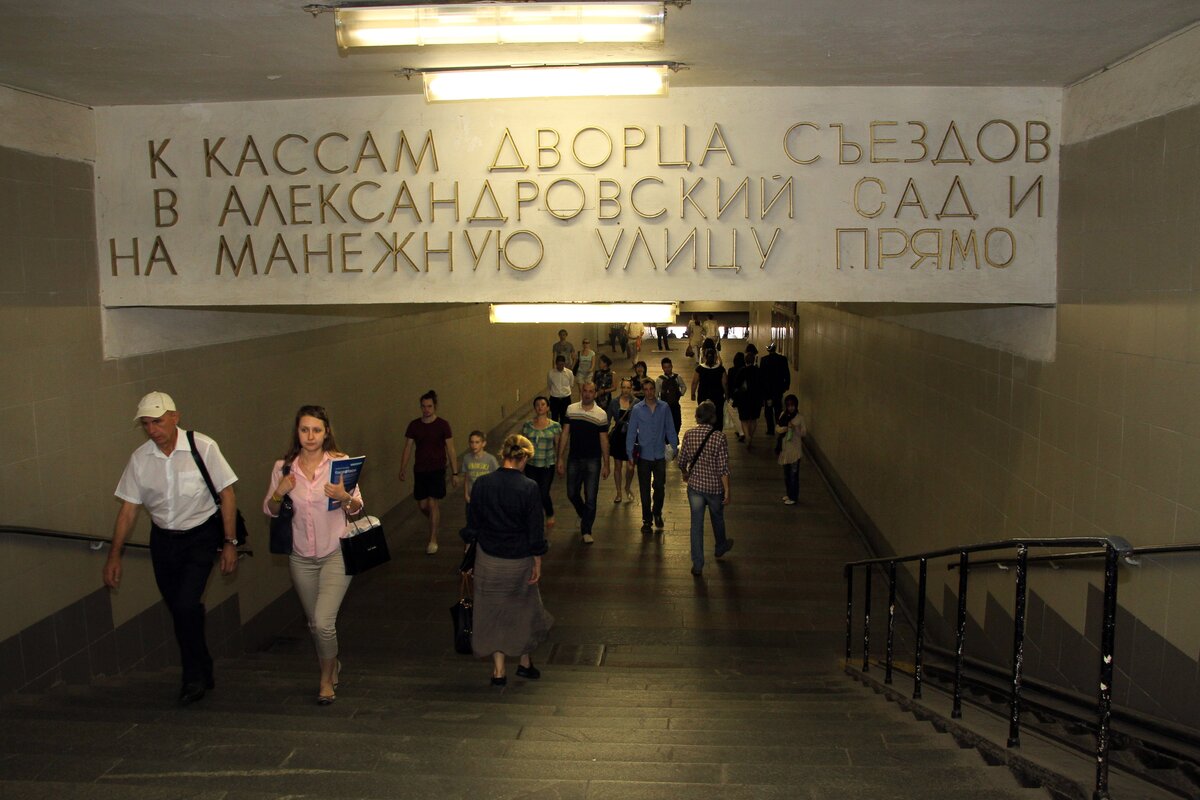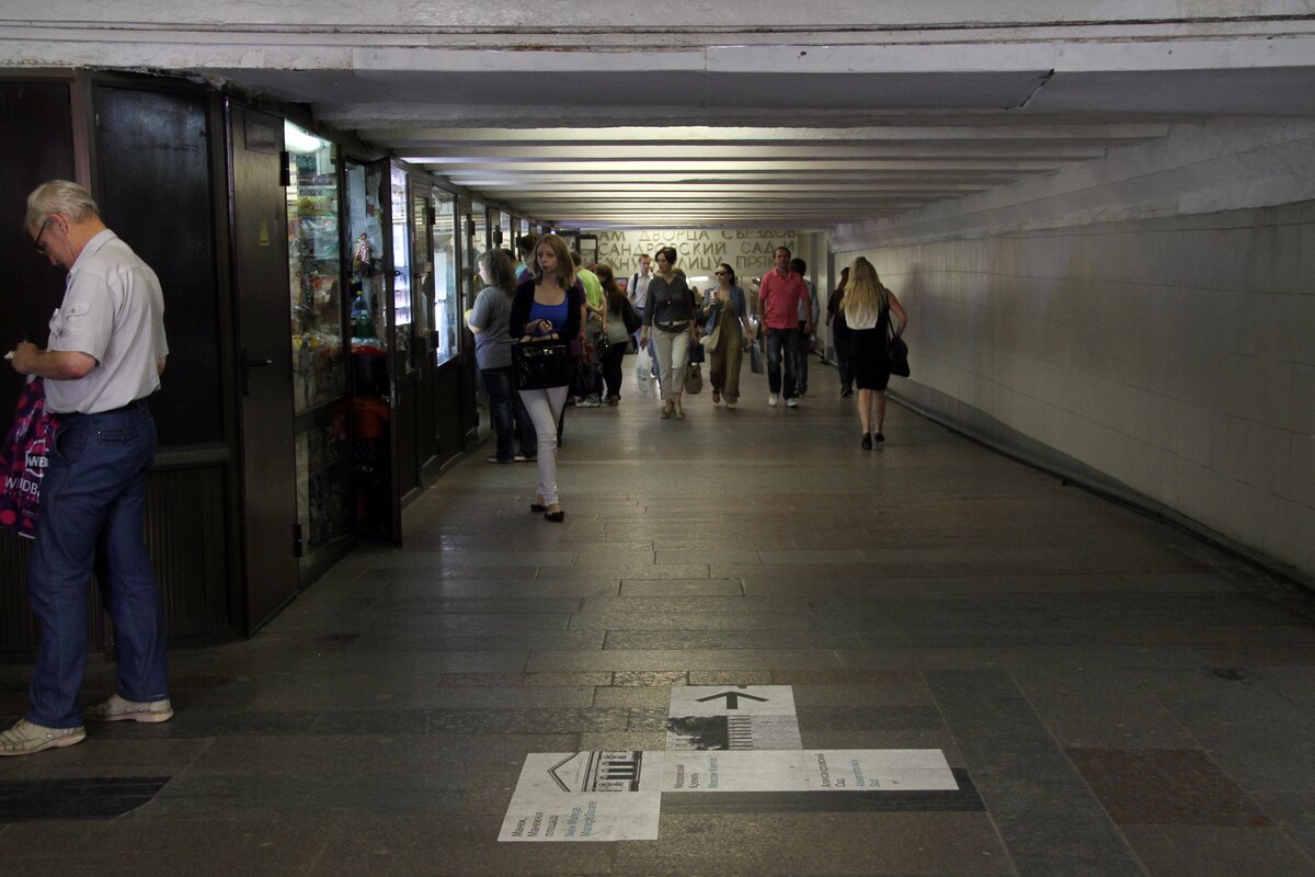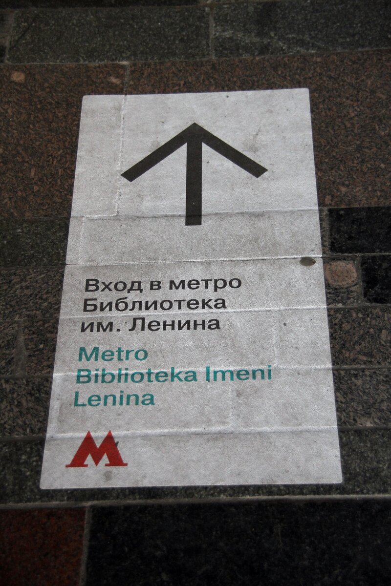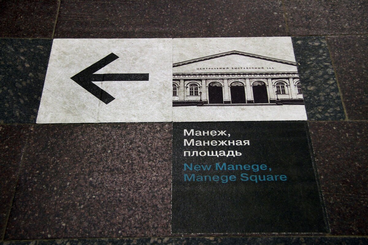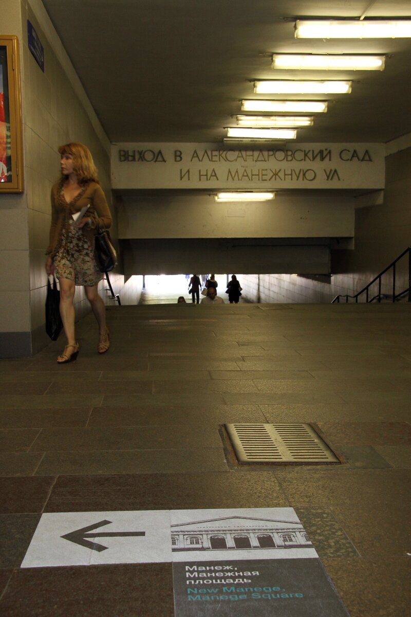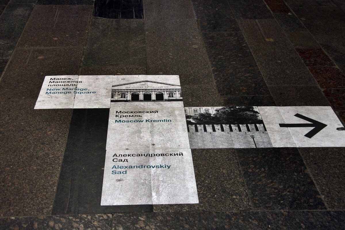 В подземном переходе у станции метро "Библиотека имени Ленина" появилась напольная навигация. На картинках, приклеенных к полу, изображены объекты, к которым ведут выходы.