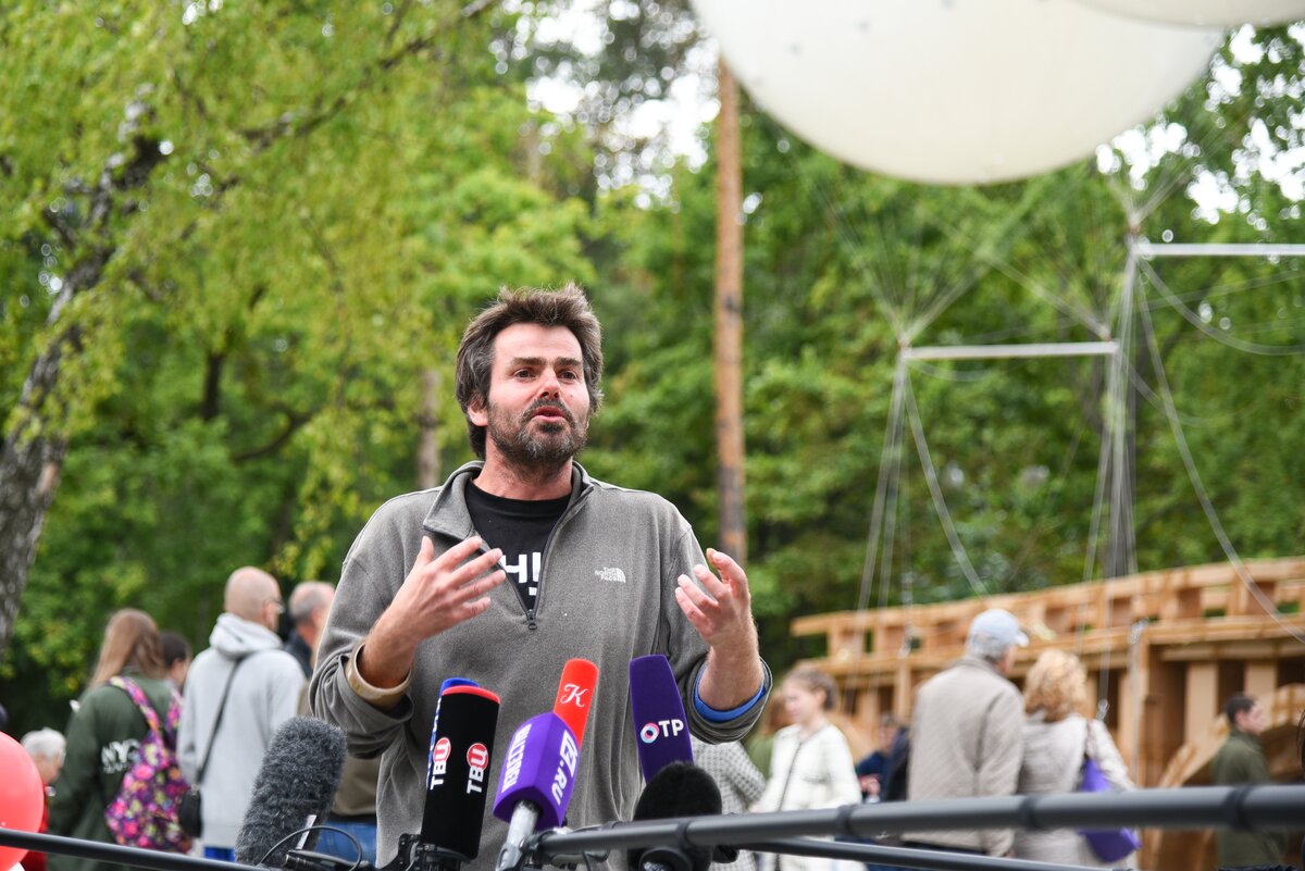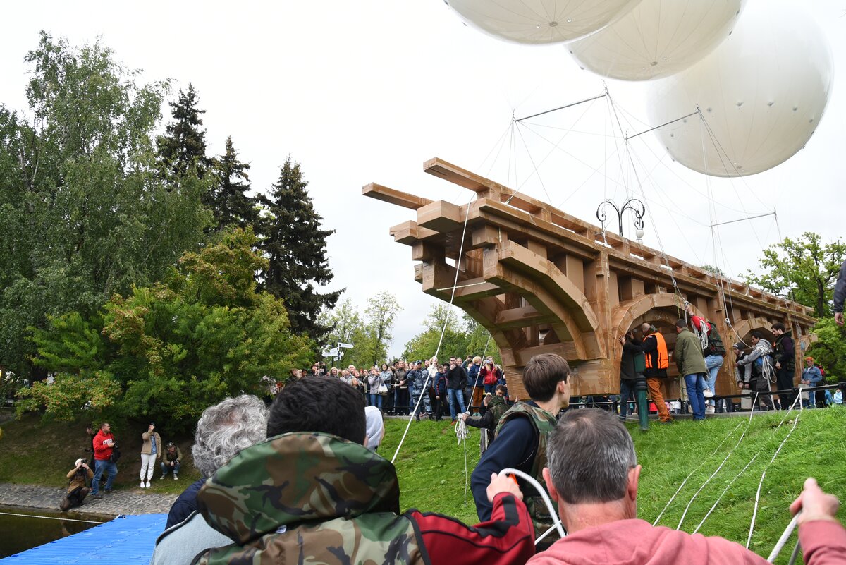 Парящий мост запустили над прудом в парке "Останкино". Около шести часов вечера техническая команда во главе с Гросстетом отцепила конструкцию от платформы над водой и вернулась на берег под бурные аплодисменты. 1/16Парящий мост запустили над прудом в парке "Останкино". Около шести часов вечера техническая команда во главе с Гросстетом отцепила конструкцию от платформы над водой и вернулась на берег под бурные аплодисменты.