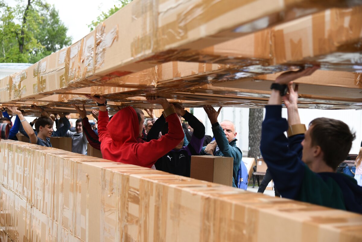 Три сотни коробок превратились в две составляющие части, которые предстояло соединить между собой с помощью специальных перемычек – тоже картонных. 8/16Три сотни коробок превратились в две составляющие части, которые предстояло соединить между собой с помощью специальных перемычек – тоже картонных.