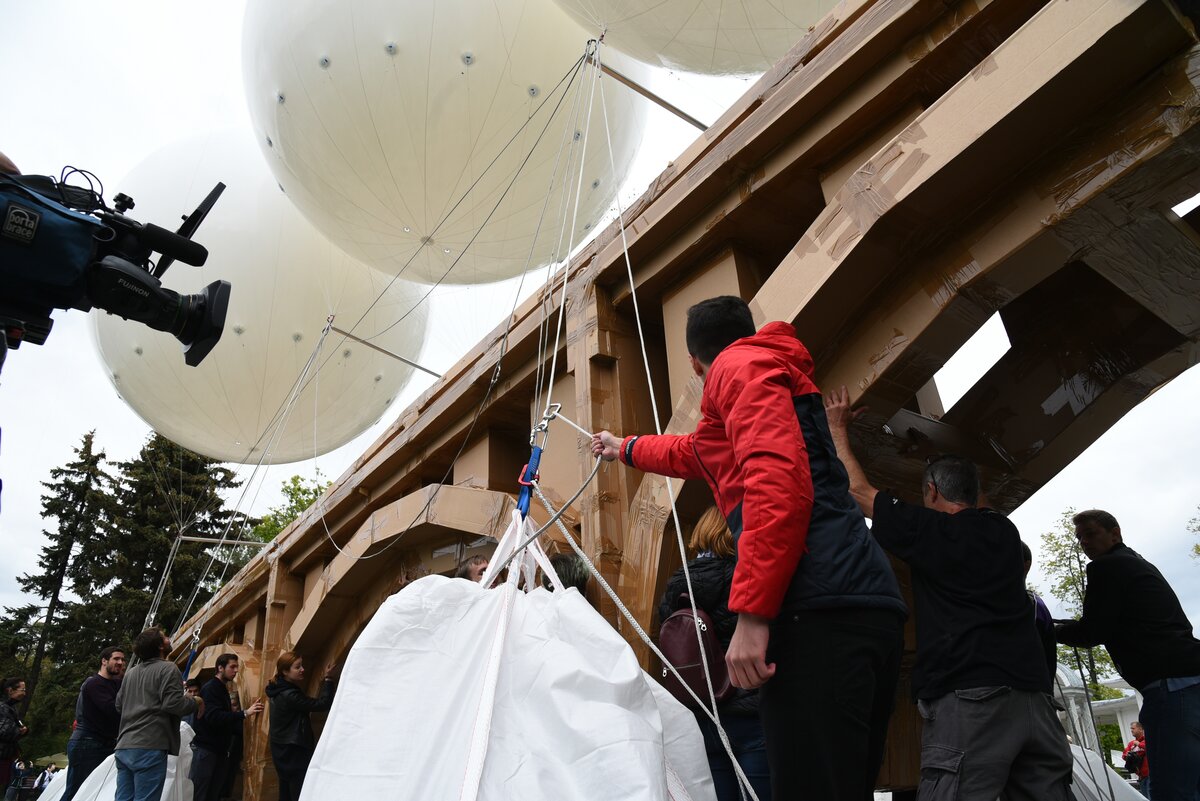 Когда мост был окончательно собран, его скрепили с тремя гигантскими воздушными шарами. Вес всей конструкции по примерным подсчетам составил около полутонны. 10/16Когда мост был окончательно собран, его скрепили с тремя гигантскими воздушными шарами. Вес всей конструкции по примерным подсчетам составил около полутонны.