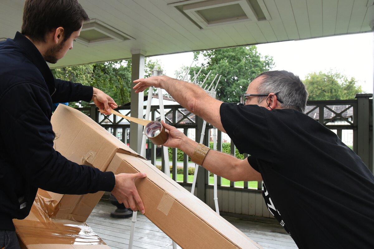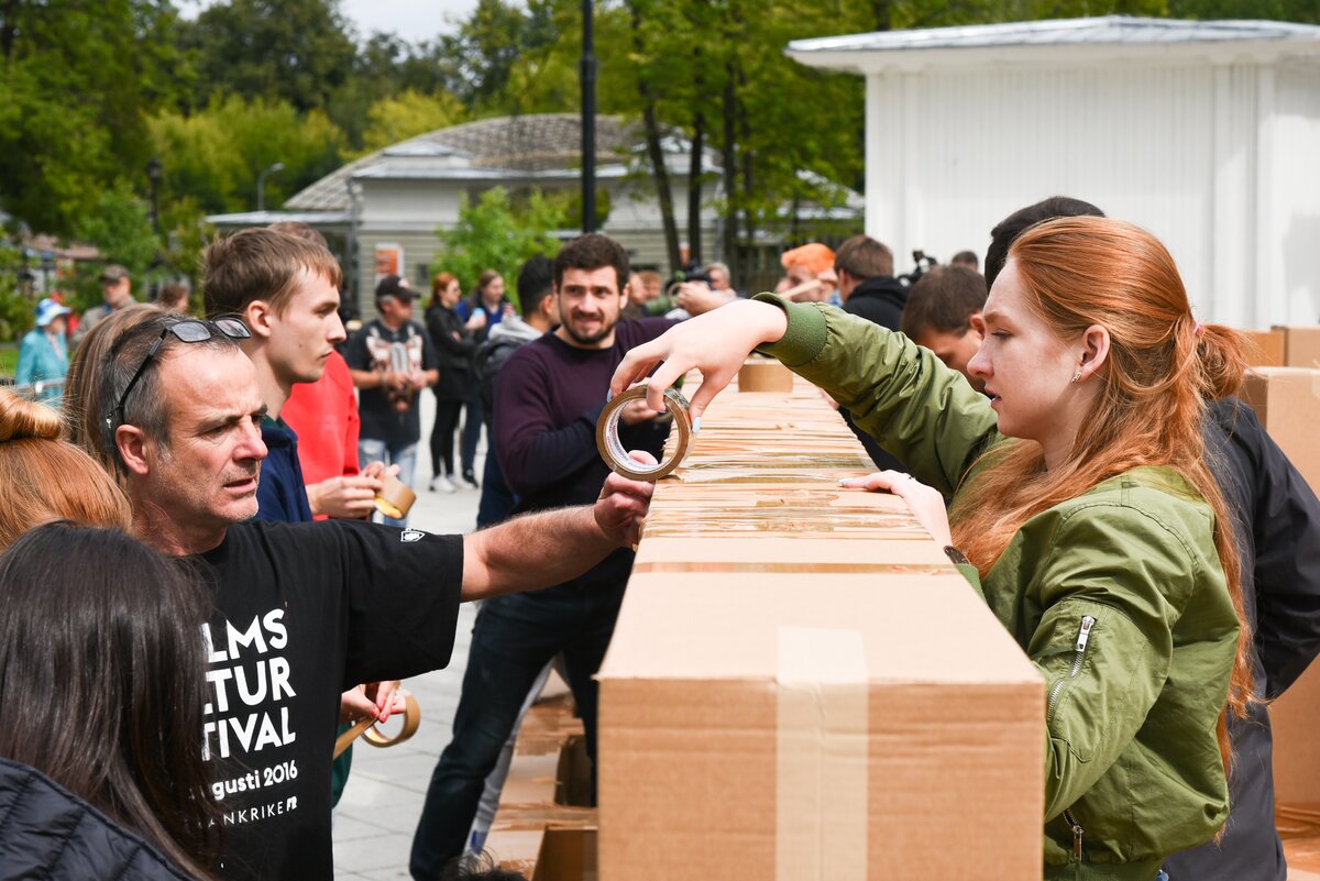В это время под навесом десяток человек вместе с Гросстетом и несколькими его помощниками скрепляли составные части моста. Основа конструкции – картонные коробки, приклеенные друг к другу скотчем по определенной технологии. Они должны быть определенного веса и формы – поэтому для работы их доставляли на заказ. Всего, по словам организаторов, потребовалось более трехсот коробок. Количество скотча никто даже не пытался подсчитать. 3/16В это время под навесом десяток человек вместе с Гросстетом и несколькими его помощниками скрепляли составные части моста. Основа конструкции – картонные коробки, приклеенные друг к другу скотчем по определенной технологии. Они должны быть определенного веса и формы – поэтому для работы их доставляли на заказ. Всего, по словам организаторов, потребовалось более трехсот коробок. Количество скотча никто даже не пытался подсчитать.