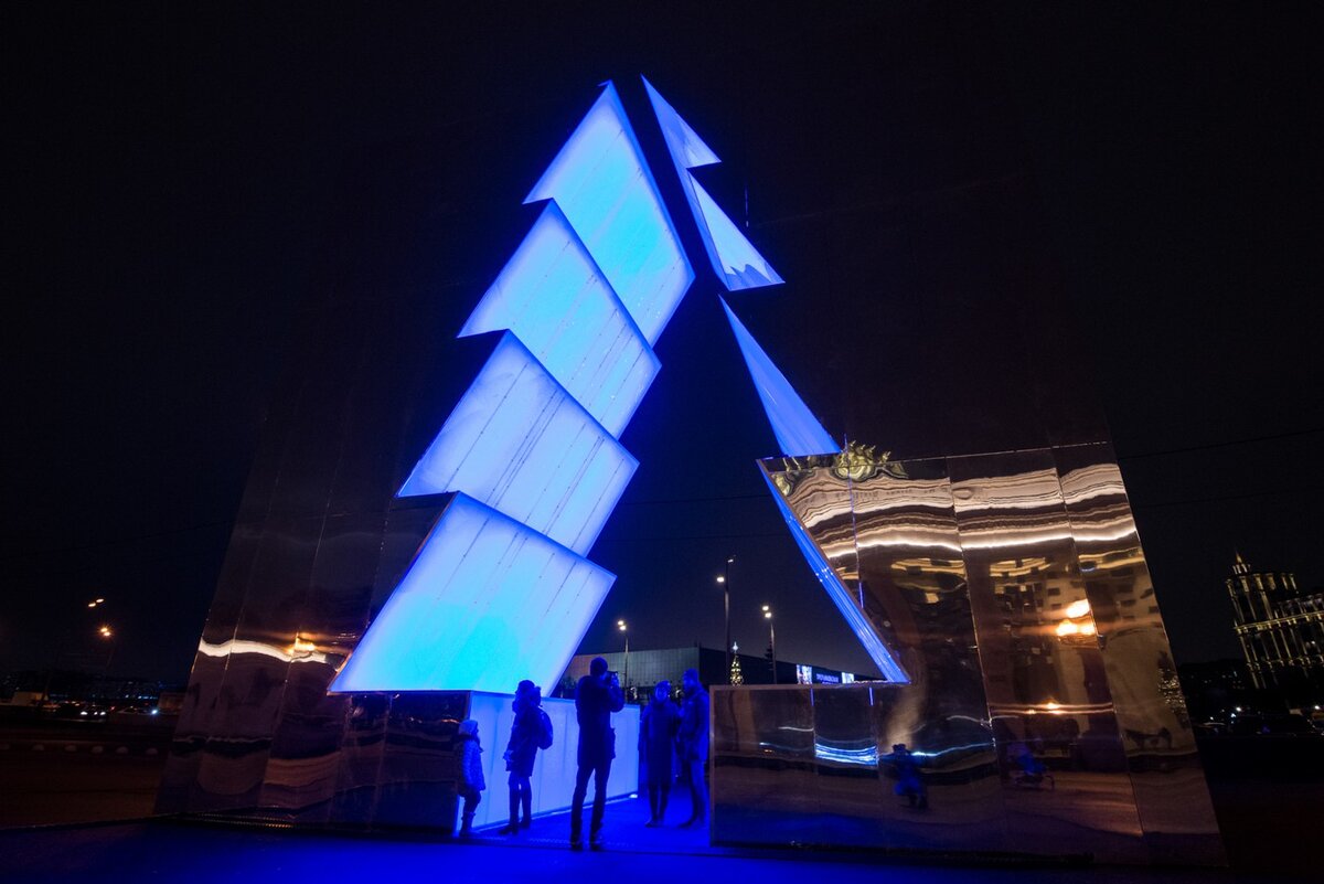 Новогоднюю елку из зеркал и светодиодов открыли в парке Горького.
