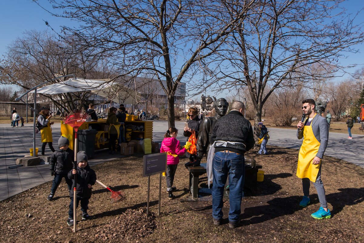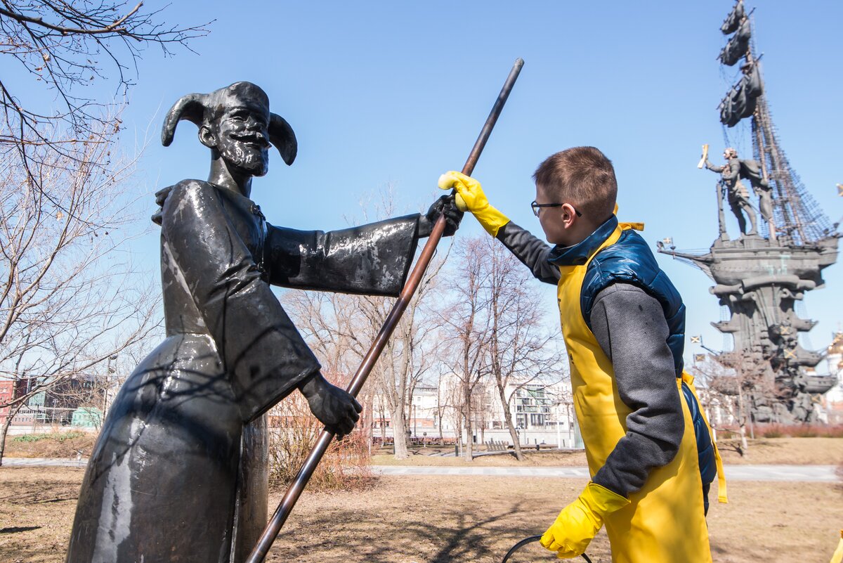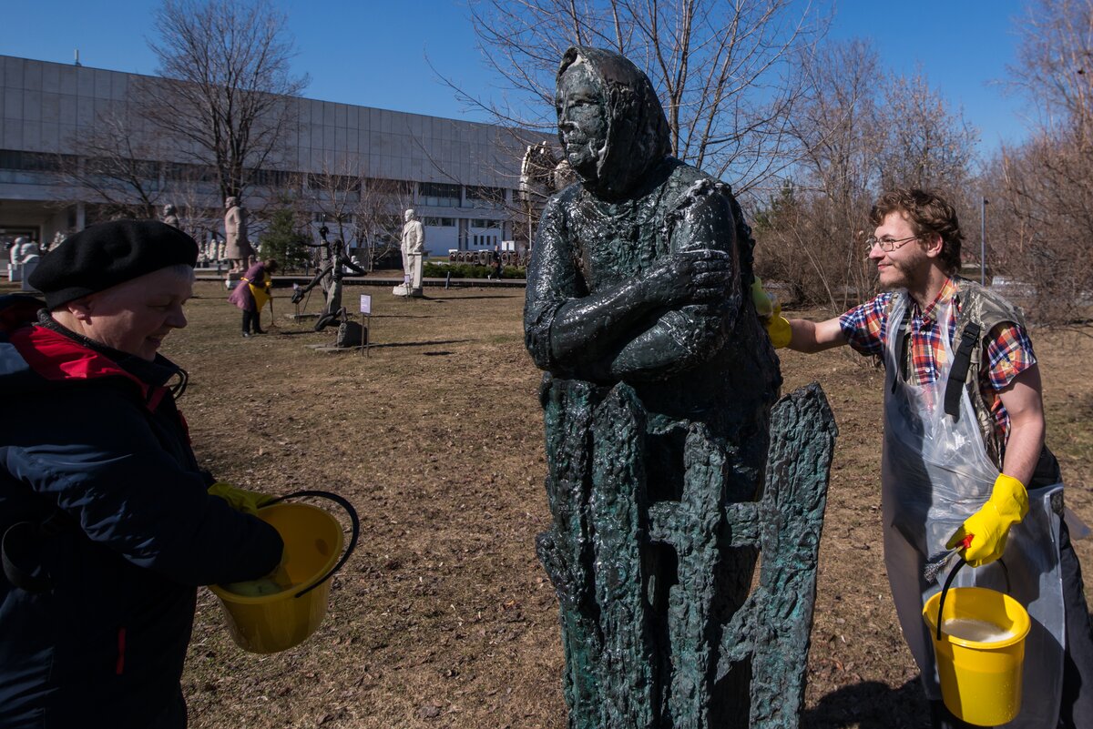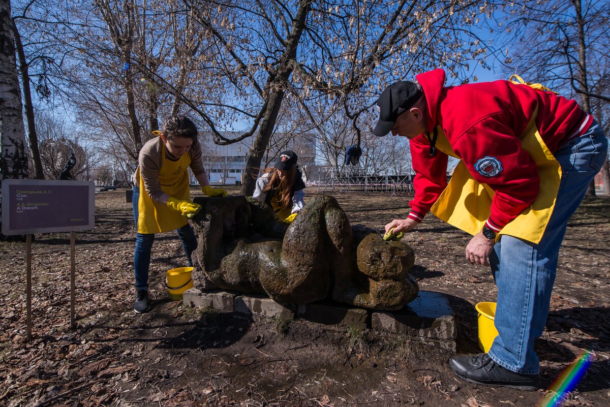 В субботу, 14 апреля, в Музеоне прошел ежегодный субботник. Как и в прошлом году, акцию "Головомойка" провело Общество желтых ведерок – открытый клуб борцов за чистоту искусства, существующий на базе Парка Горького. Миссия Общества – расчистить Парк от зимней серости и освободить дорогу весне. Проект подготовлен совместно с Мосгорпарком.