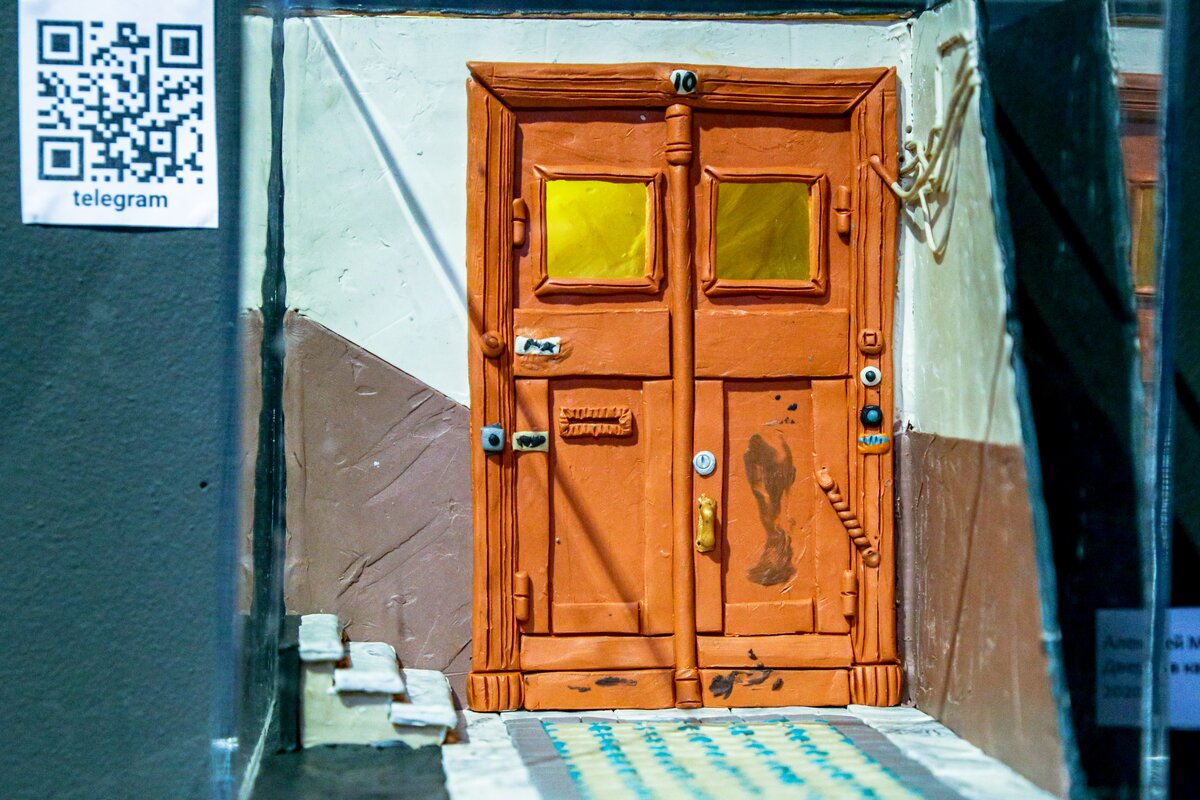 Посетители могут увидеть входную дверь в коммуналку, в верхней части – стекло, за ним – слабый свет. Гости почувствуют странное и смешное ощущение после знакомства с работами автора.