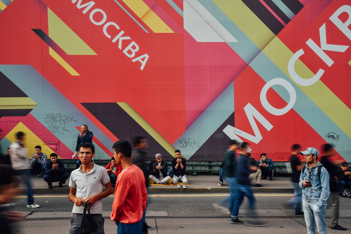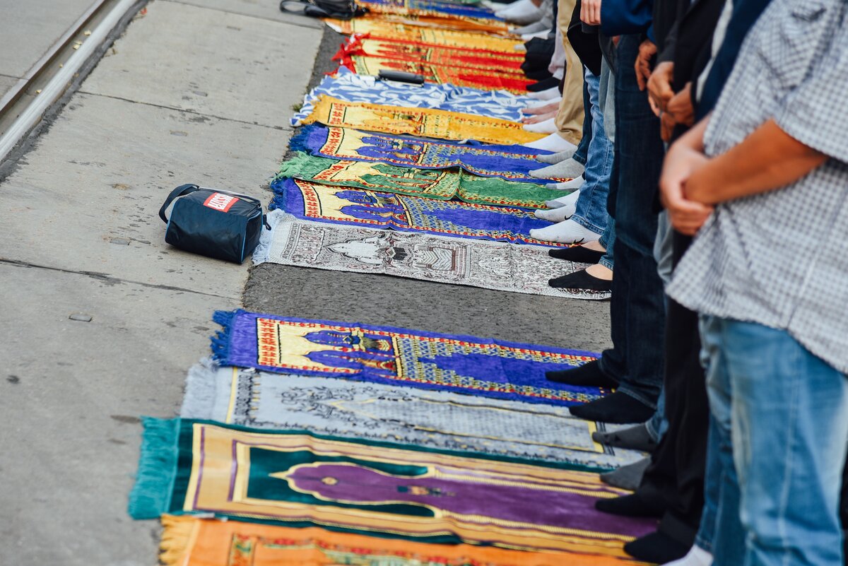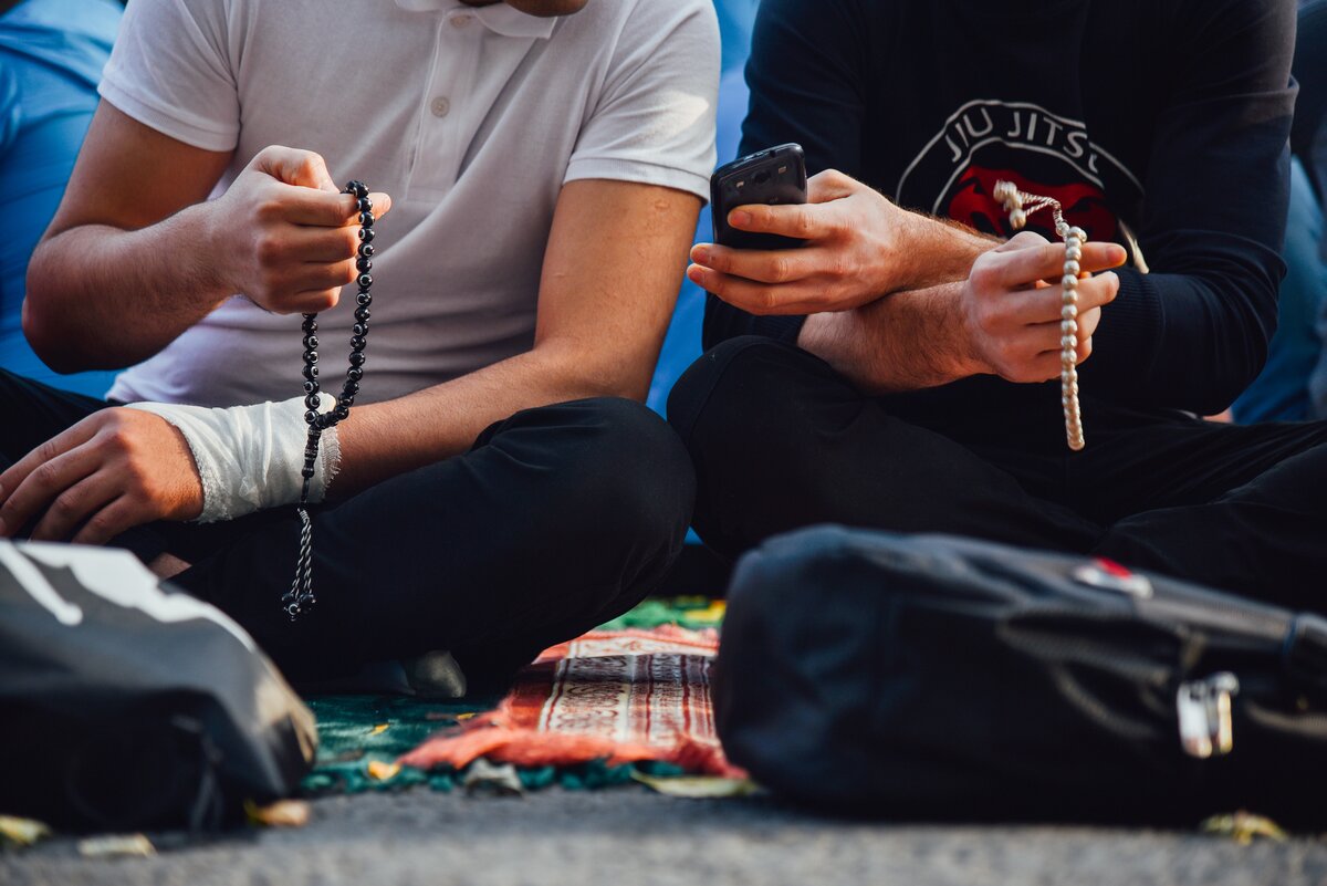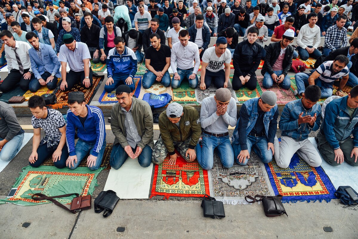 Ни в коем случае нельзя вставать на молитвенный коврик в обуви. Поэтому мужчины в ожидании праздничной молитвы стоят в носках или босиком 8/16Ни в коем случае нельзя вставать на молитвенный коврик в обуви. Поэтому мужчины в ожидании праздничной молитвы стоят в носках или босиком