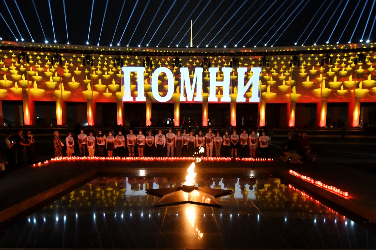 Ровно в полночь собравшиеся на площади перед Музеем Победы почтили память погибших минутой молчания. Волонтеры и ветераны зажгли от Вечного огня ровно 1 418 свечей – по числу дней Великой Отечественной войны.