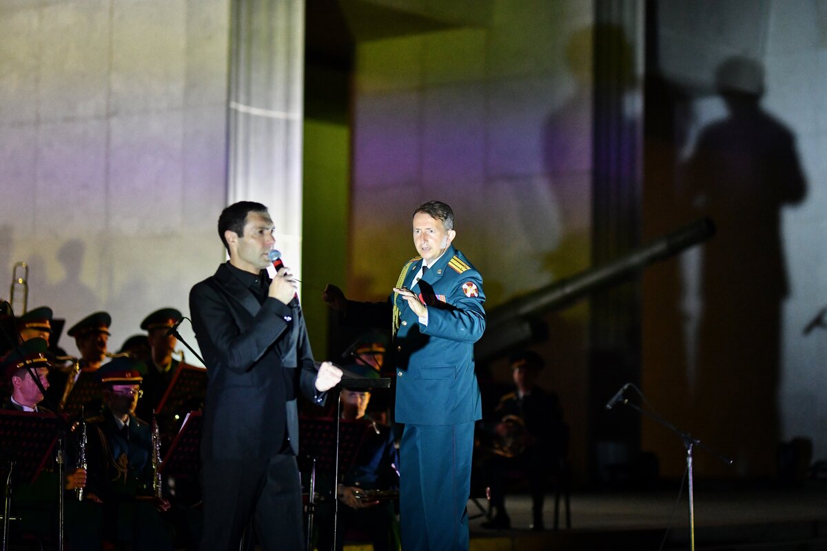 Образцово-показательный оркестр ансамбля Росгвардии с солистом Евгением Кунгуровым исполнил песни, посвященные павшим в боях Великой Отечественной.