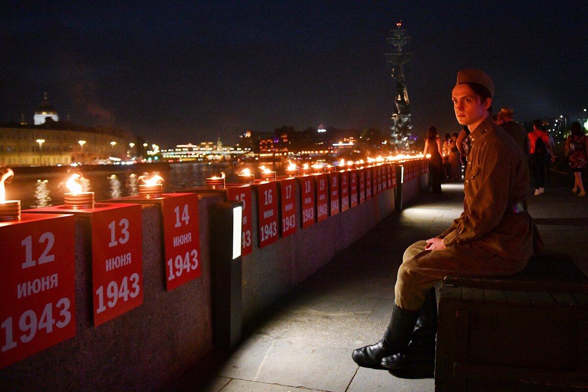 В ночь на 22 июня перед Музеем Победы зажгли 1 418 свечей – столько же дней продолжалась Великая Отечественная война, которая началась 78 лет назад. Каждая из свечей символизирует один день кровопролитной войны. Их зажгли представители общественных организаций, волонтеры и военнослужащие. Одновременно на фасад Музея Победы была спроецирована грандиозная светозвуковая инсталляция. 1/19 Фото: Москва 24/Антон ВеликжанинФото: Москва 24/Антон Великжанин