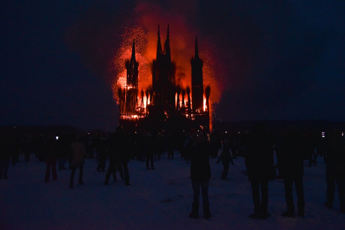 Каждый год по случаю Масленицы в Николо-Ленивце строят арт-объект, который сжигают в конце дня. В этом году для сожжения была построена "Пламенеющая готика" – 30-метровое готическое здание из веток ольхи и деревянного мусора. 14/18Каждый год по случаю Масленицы в Николо-Ленивце строят арт-объект, который сжигают в конце дня. В этом году для сожжения была построена "Пламенеющая готика" – 30-метровое готическое здание из веток ольхи и деревянного мусора.