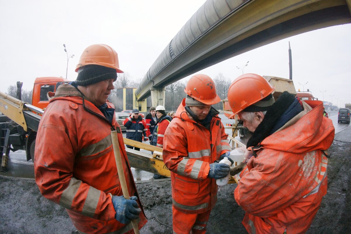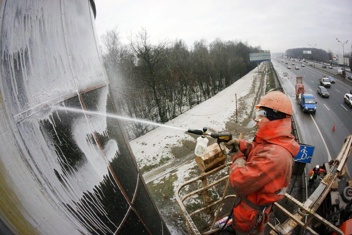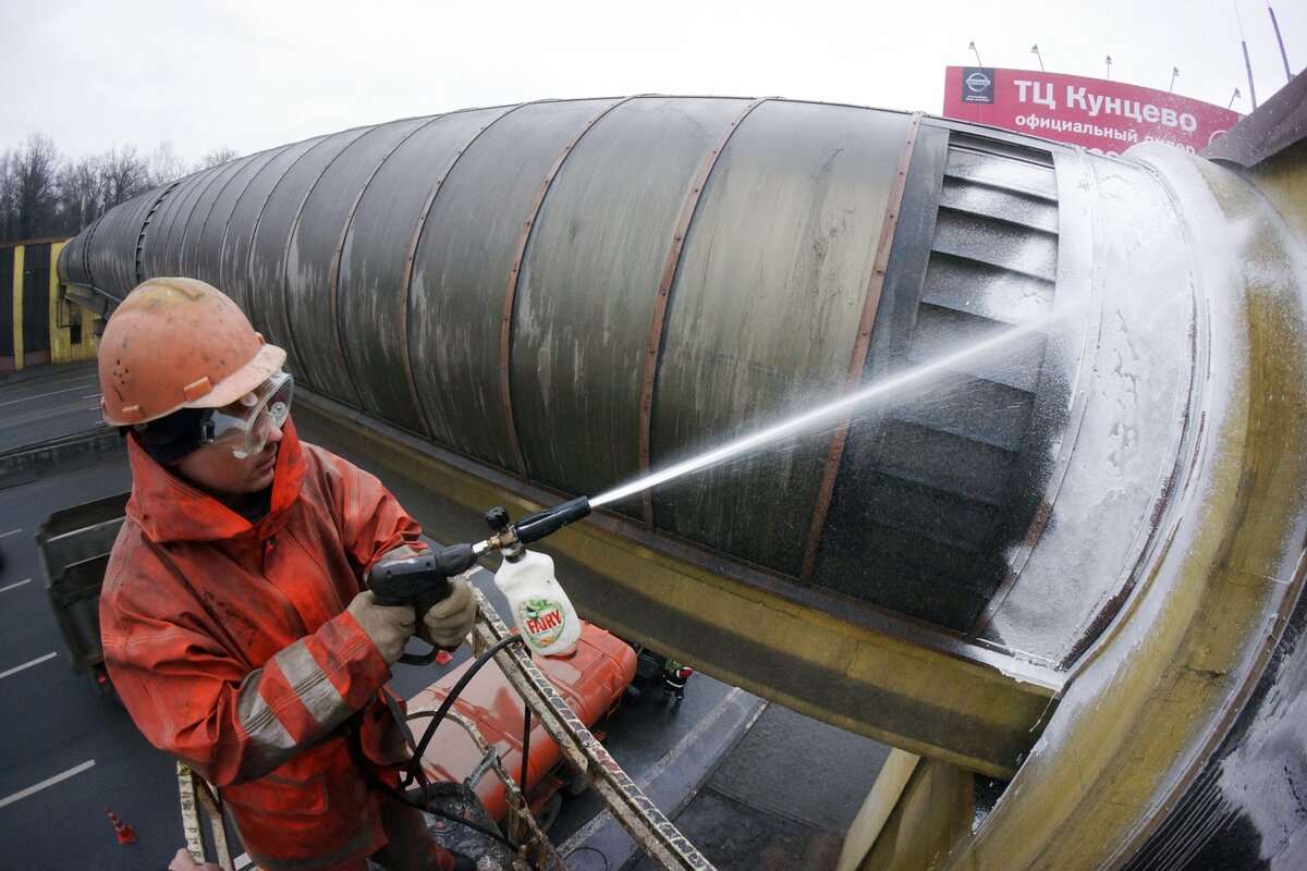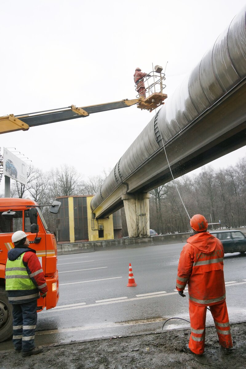 Московские коммунальщики моют надземный пешеходный переход. Смотрите фотоподборку M24.ru.