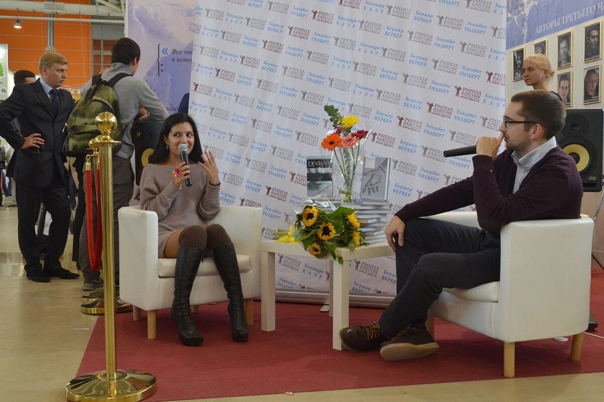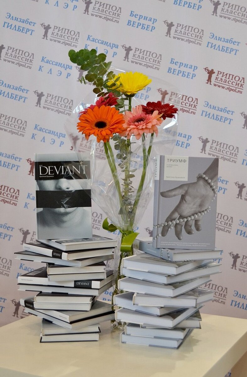 7 сентября, в субботу, в рамках ММКВЯ на ВВЦ молодая писательница Кристина Хуцишвили представила свой второй роман. Со вступительным словом выступил известный французский писатель Бернар Вербер. Роман "Триумф" продолжает тему "лишнего человека" в современном мире. Юная героиня книги страдает от депрессии, апатии и неприятия мира.