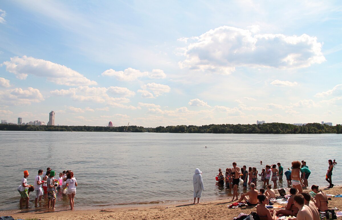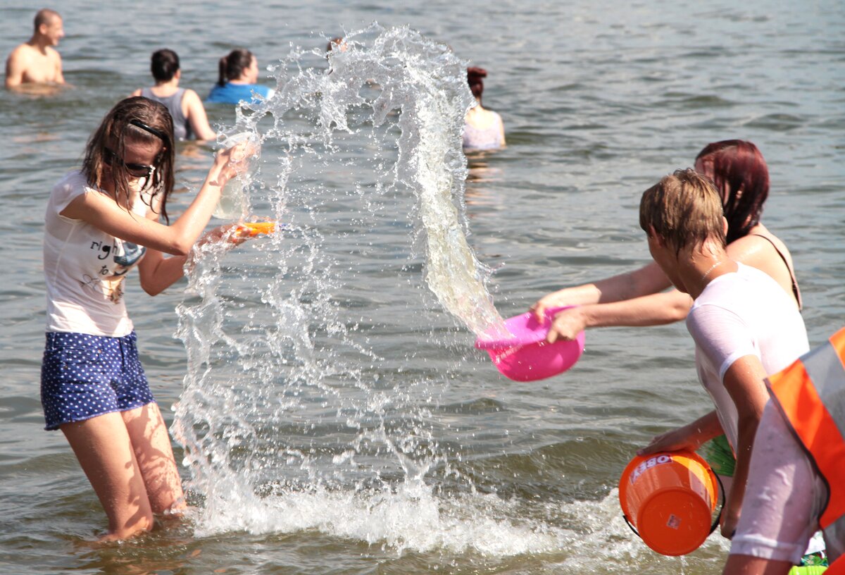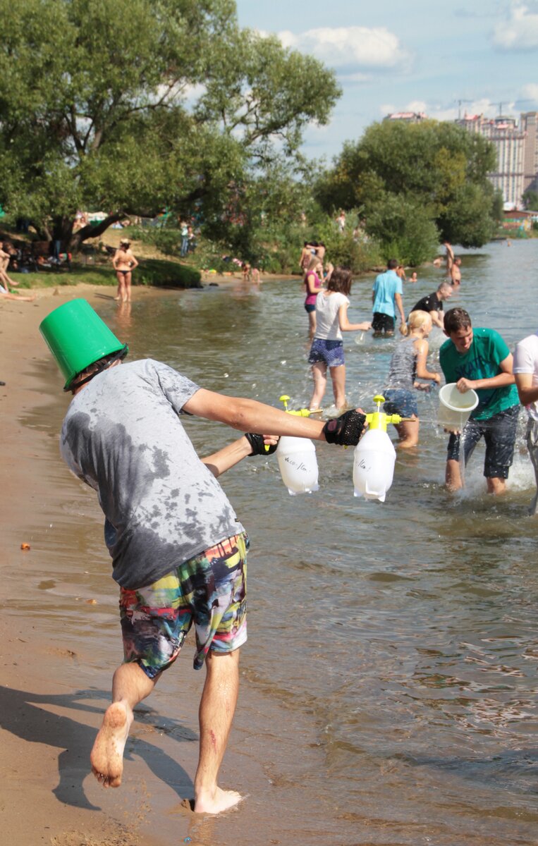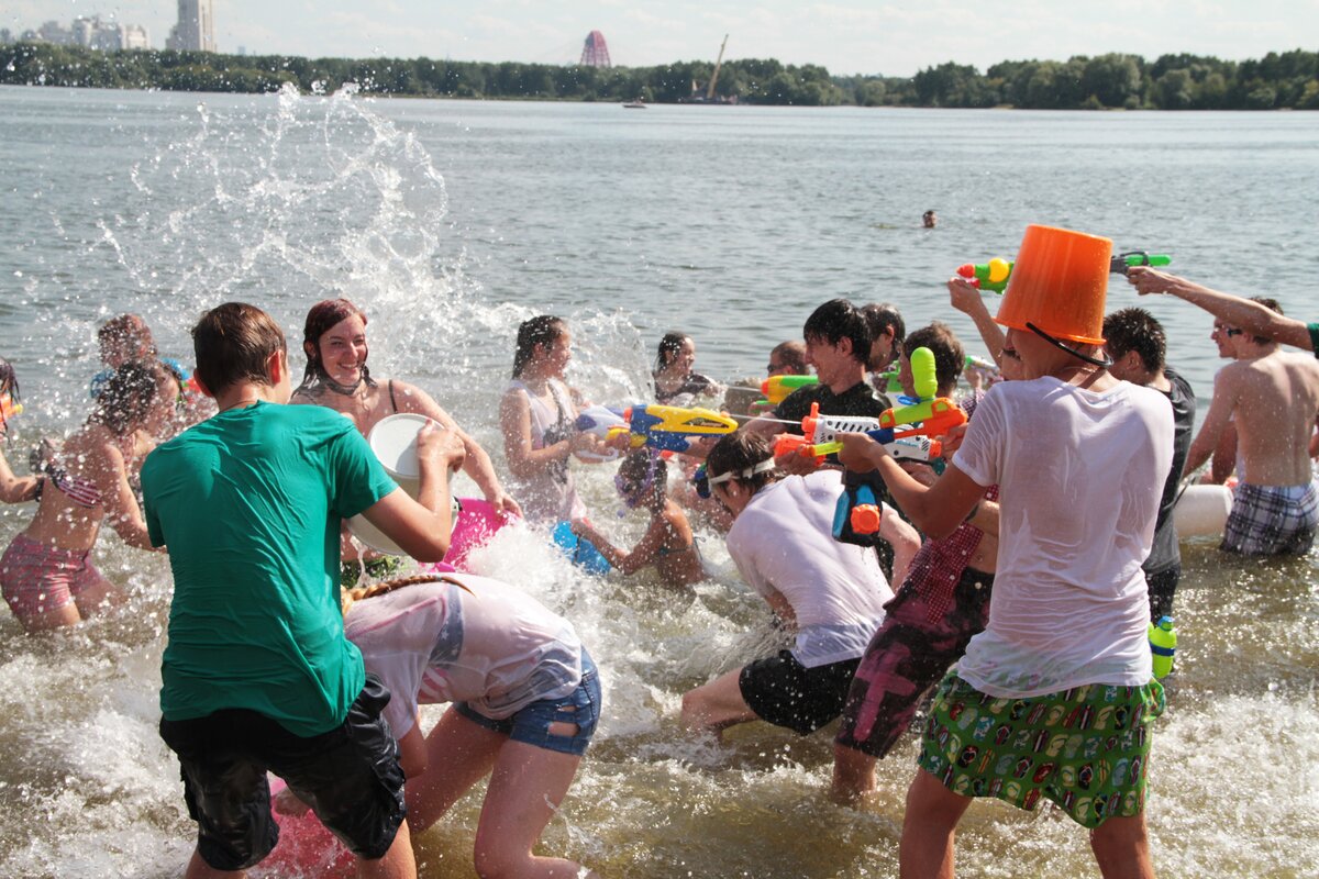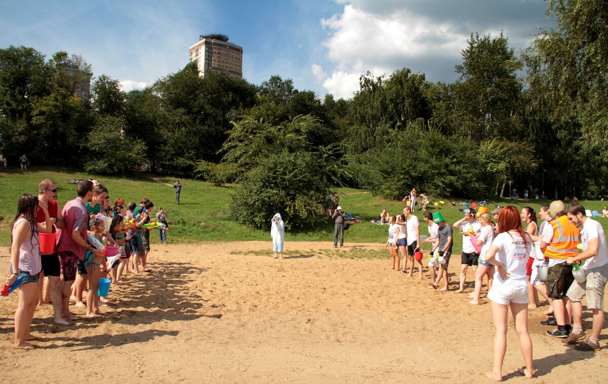 18 августа на пляже в Строгино провели водную битву. Оружием стали водные пистолеты, ведра и бутылки с дырявыми крышками. Участников сражений разделили на две команды по цвету их одежды - на "цветных" и "белых".