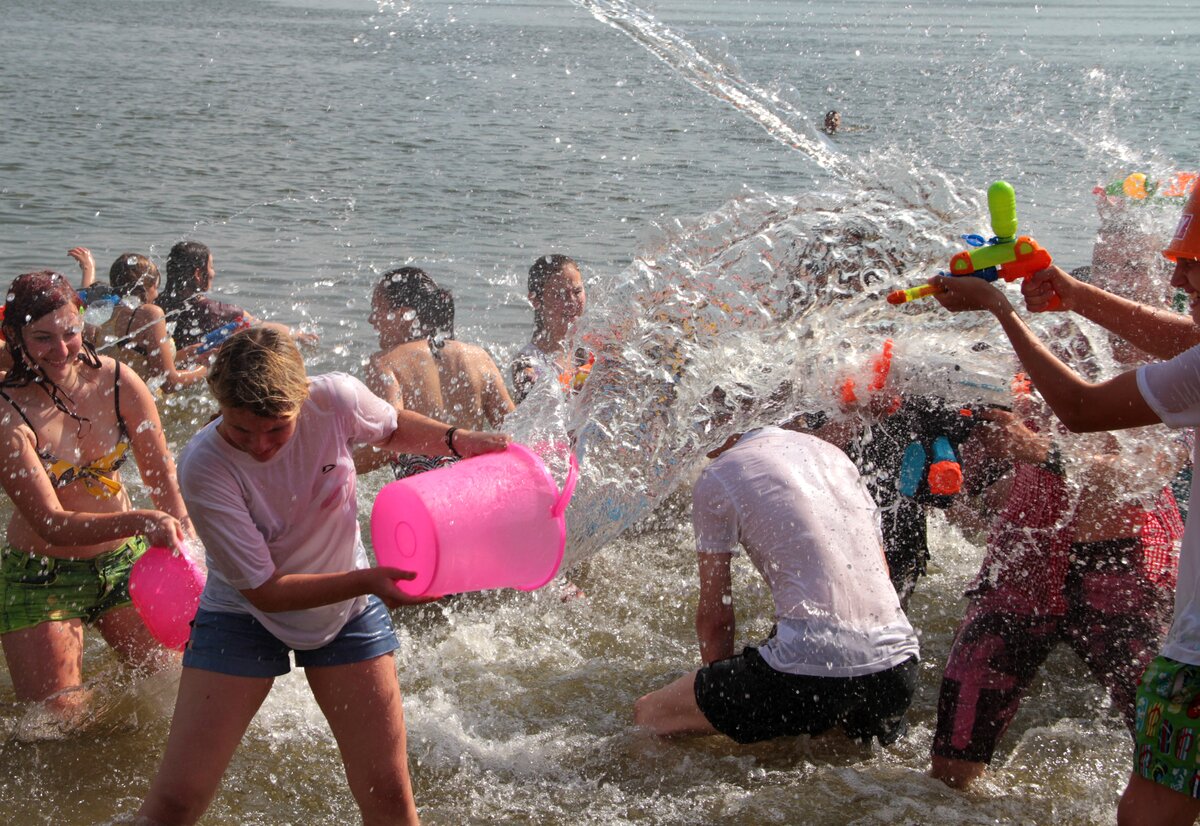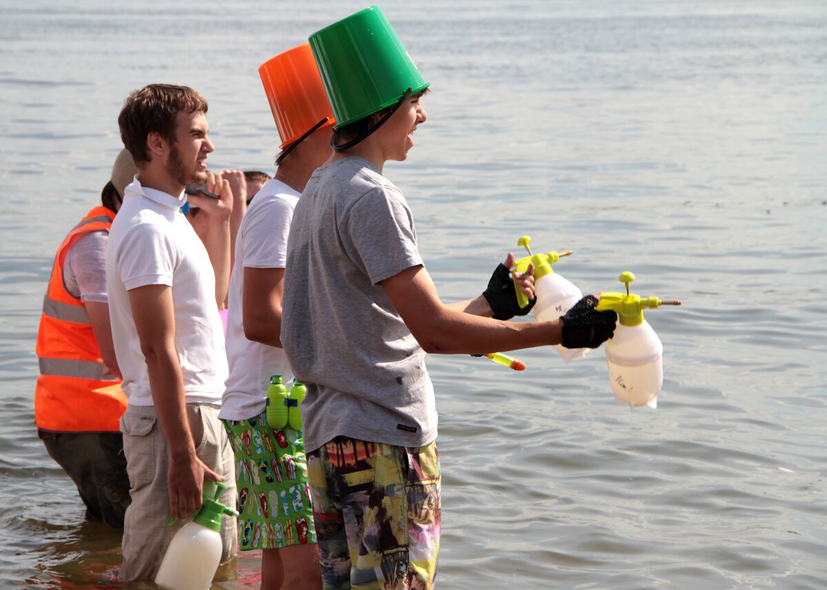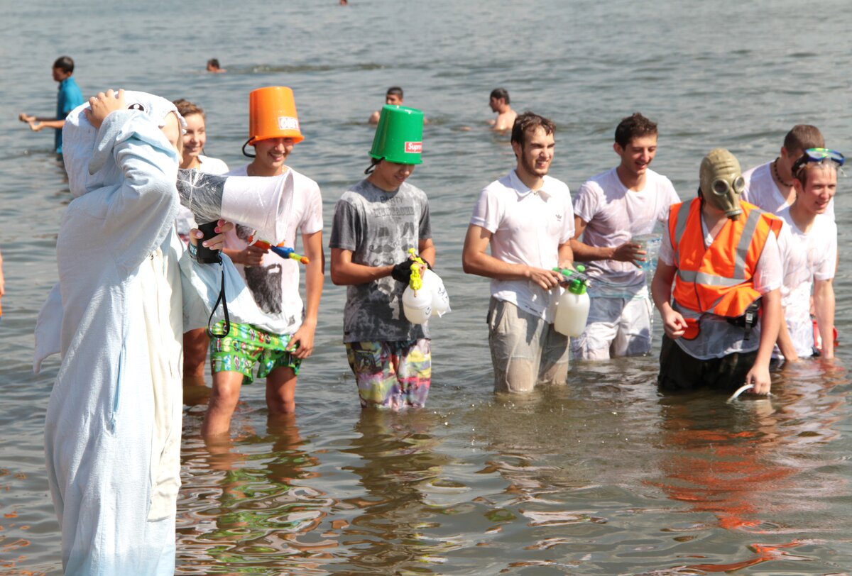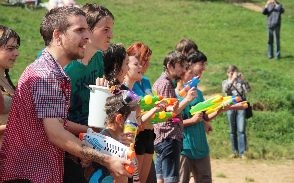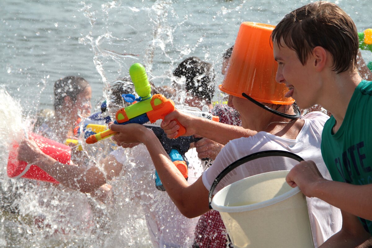 18 августа на пляже в Строгино провели водную битву. Оружием стали водные пистолеты, ведра и бутылки с дырявыми крышками. Участников сражений разделили на две команды по цвету их одежды - на "цветных" и "белых".