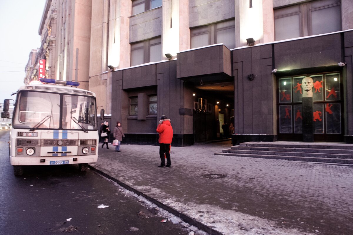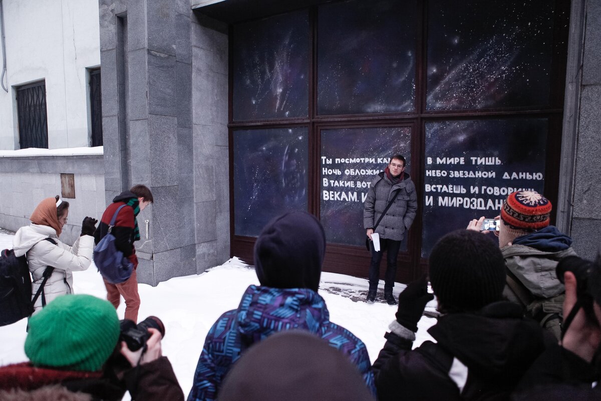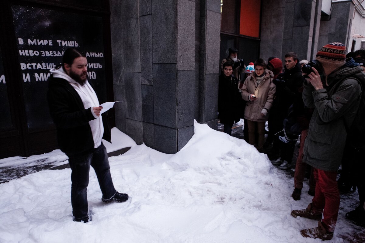 У входа в Государственный музей Маяковского на Лубянке в минувшие выходные прошли Маяковские чтения. Участники решили провести чтения внепланово в связи со сложившейся вокруг музея непростой ситуацией – летом этого года музей Маяковского должны закрыть на реконструкцию, однако не все верят в положительный ее исход. Во время чтений перед входом в музей дежурили два полицейских автобуса, однако самим чтениям полиция не препятствовала.