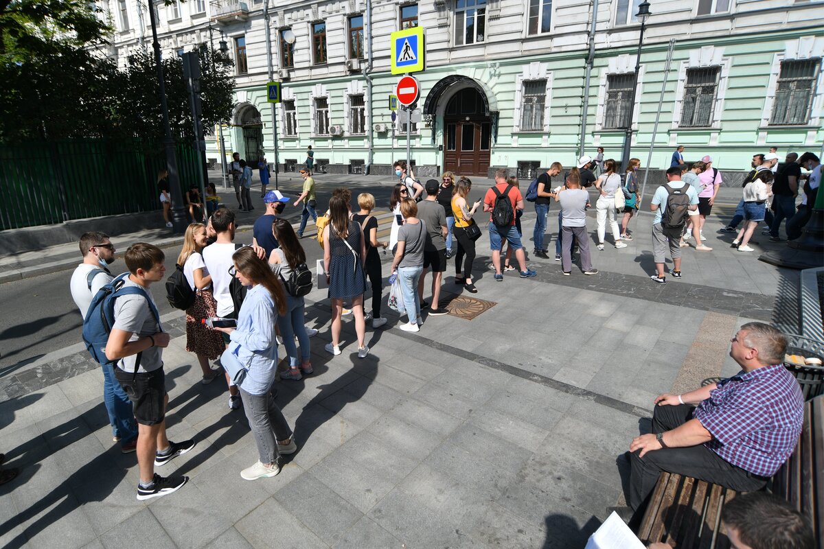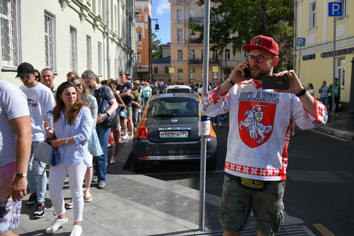 У посольства Белоруссии в Москве образовалась крупная очередь. Пришедшие собрались проголосовать на выборах президента республики, которые начались утром воскресенья, 9 августа.