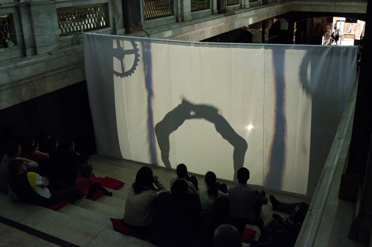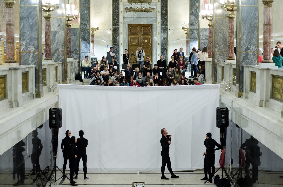 27 октября в Библиотеке на огромной мраморной лестнице прошла торжественная церемония открытия Года Аристотеля в России. Там была воссоздана атмосфера античного амфитеатра. Прямо на ступенях творческая лаборатория "Prana Lab" воплотила аллюзию на миф Платона о пещере – танцоры, артисты балета, акробаты показали песочное шоу и представление театра теней.