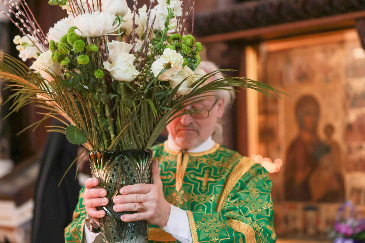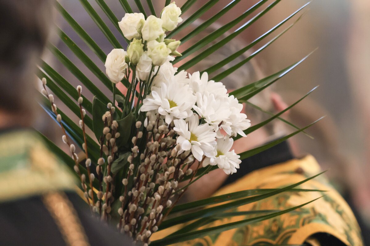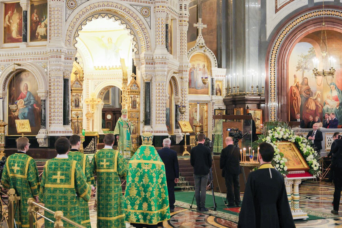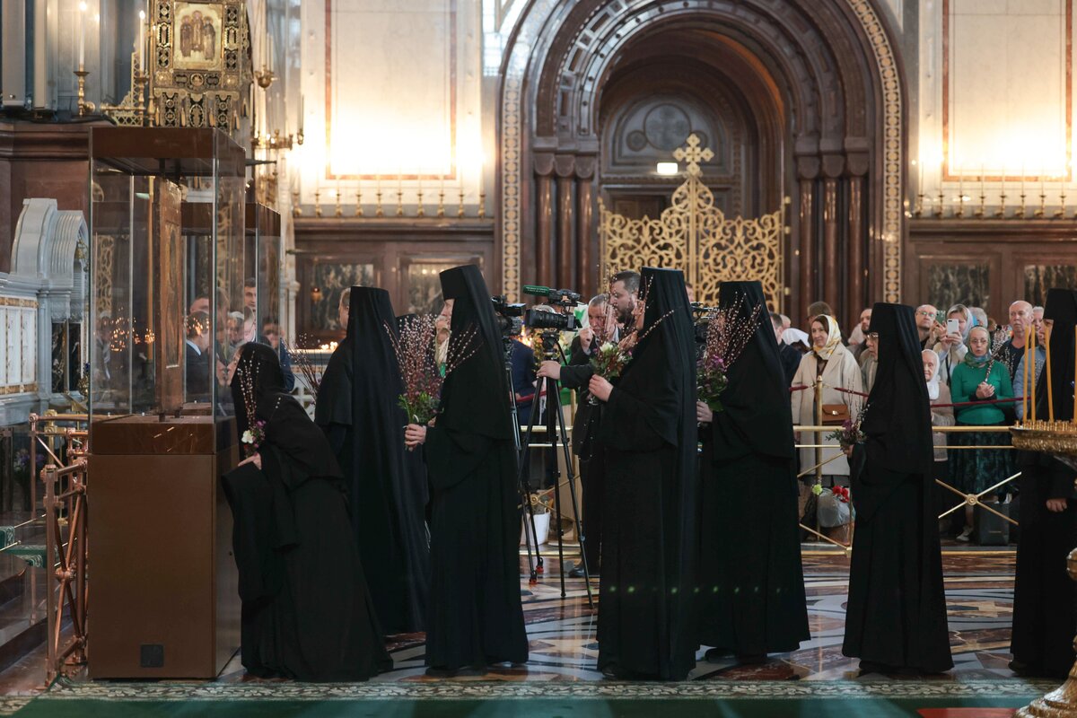В начале богослужения патриарх подошел к иконам Владимирской и Донской Божией Матери, доставленным в Храм Христа Спасителя накануне богослужения. После чтения Евангелия предстоятель Русской православной церкви совершил традиционное освящение вербных и пальмовых ветвей (ваий).