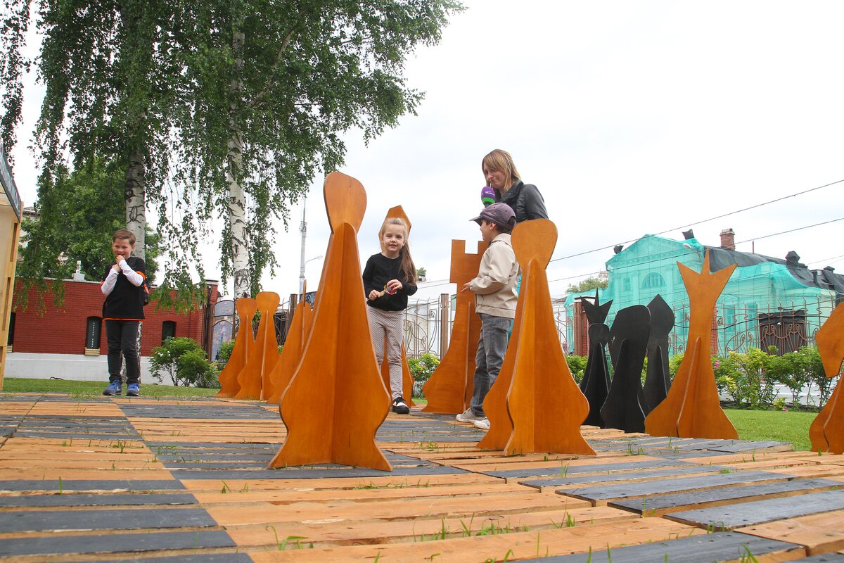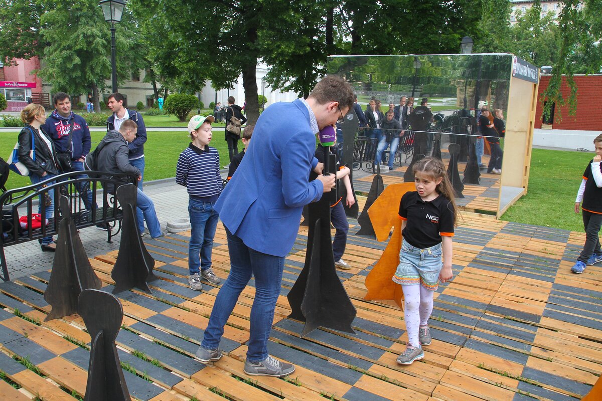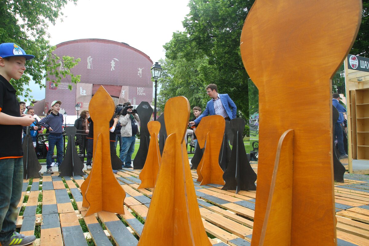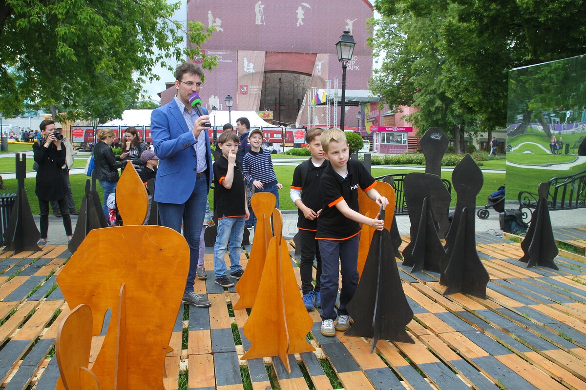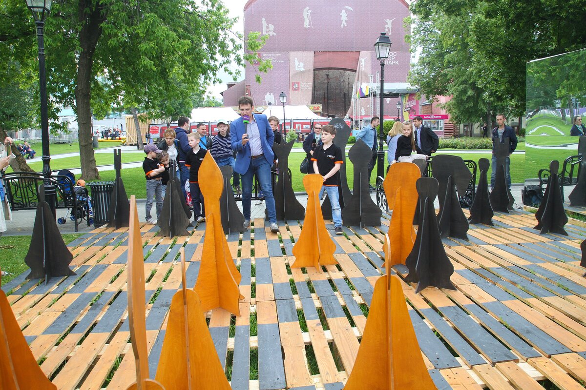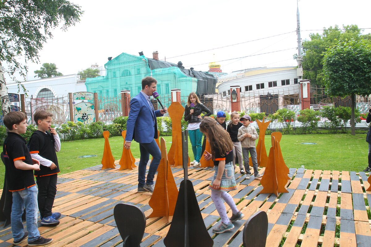 Новый интерактивный экологический арт-объект – площадку большой шахматной доски телеканала "Москва 24" открыли в саду "Эрмитаж" в рамках празднования Дня Молодежи.