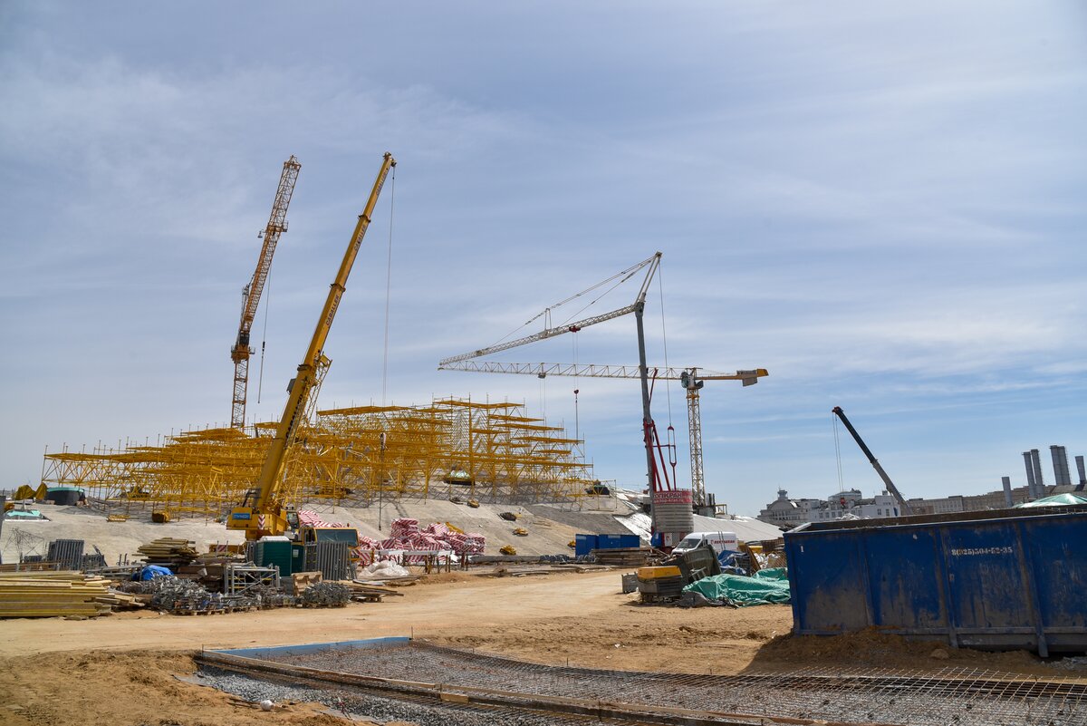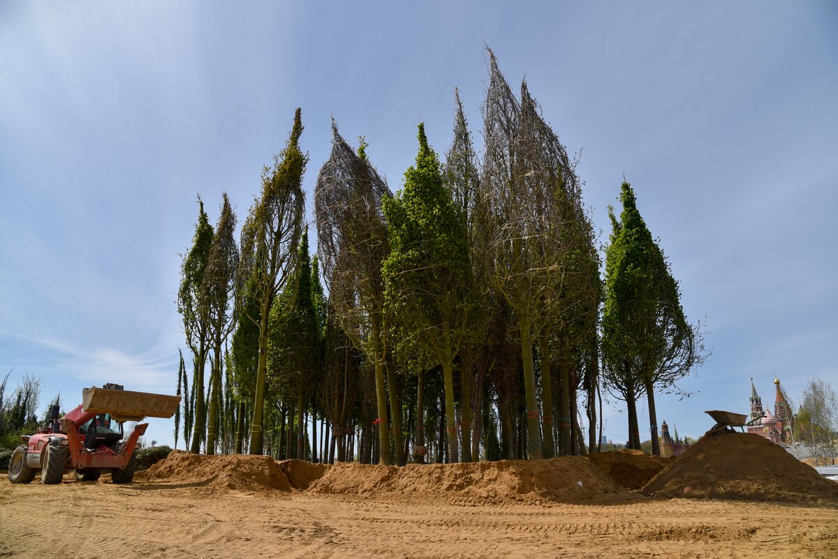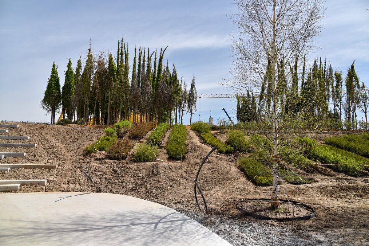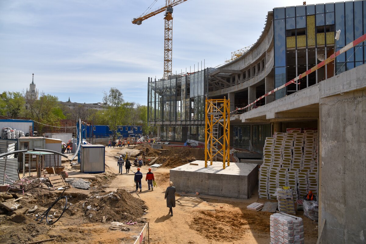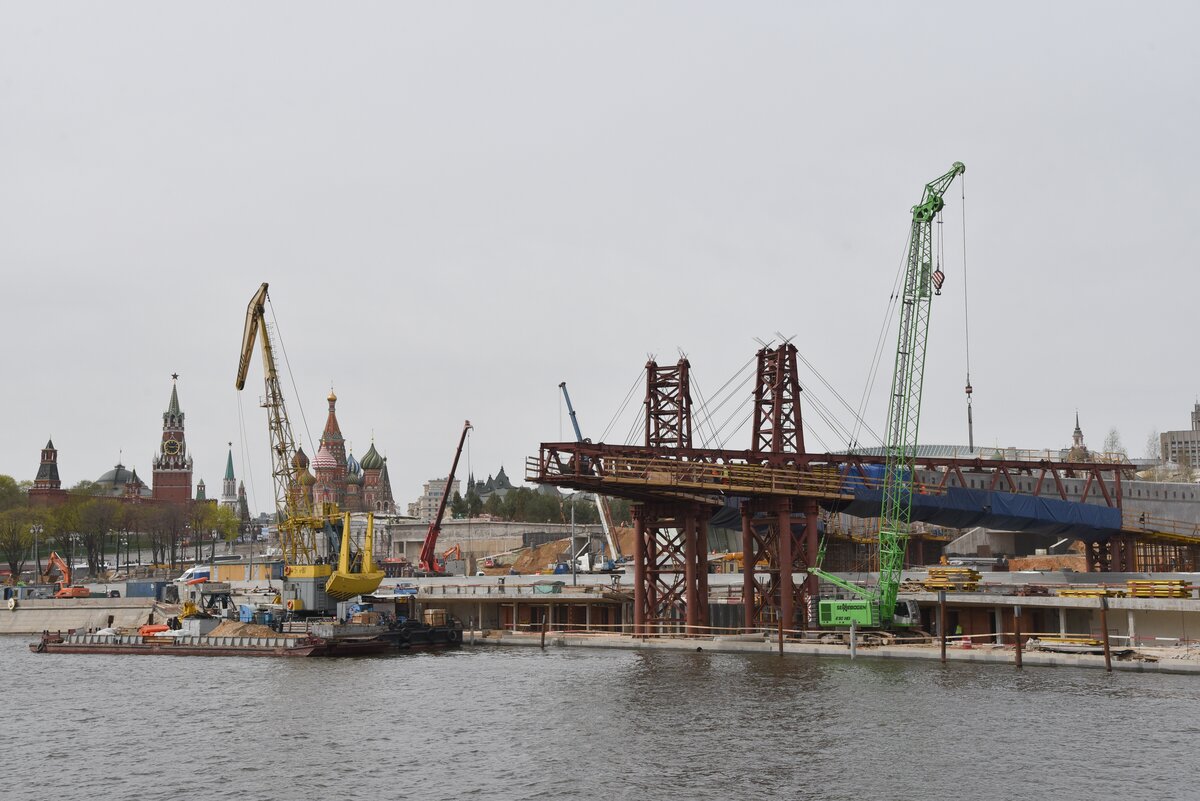 Сейчас завершается строительство новой смотровой площадки над Москвой-рекой – уникального "парящего моста". Продолжается высадка деревьев. В павильонах будущего парка начаты отделочные работы.