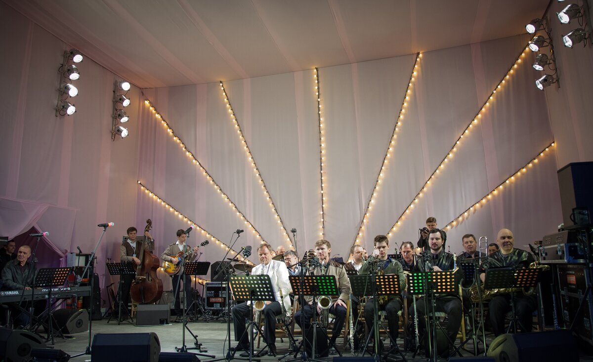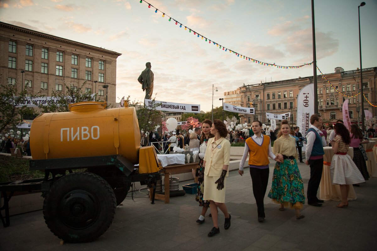На время празднования площадь оформили в стиле начала 60-х: установили киоски с сахарной ватой и ситро, под музыку оркестра Игоря Бутмана вальсировали стиляги.
