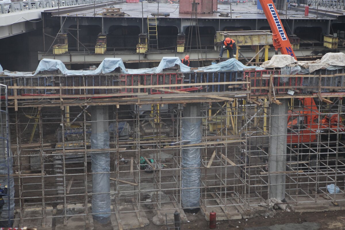 Реконструкция путепровода на пересечении Ленинградского шоссе с железнодорожными путями Малого кольца МЖД вошла в финальную стадию. Первый заместитель руководителя департамента строительства Петр Аксенов и представители подрядной организации показали журналистам площадку, на которой ведутся работы на данный момент, и рассказали о том, что осталось сделать.