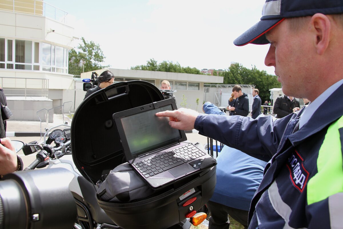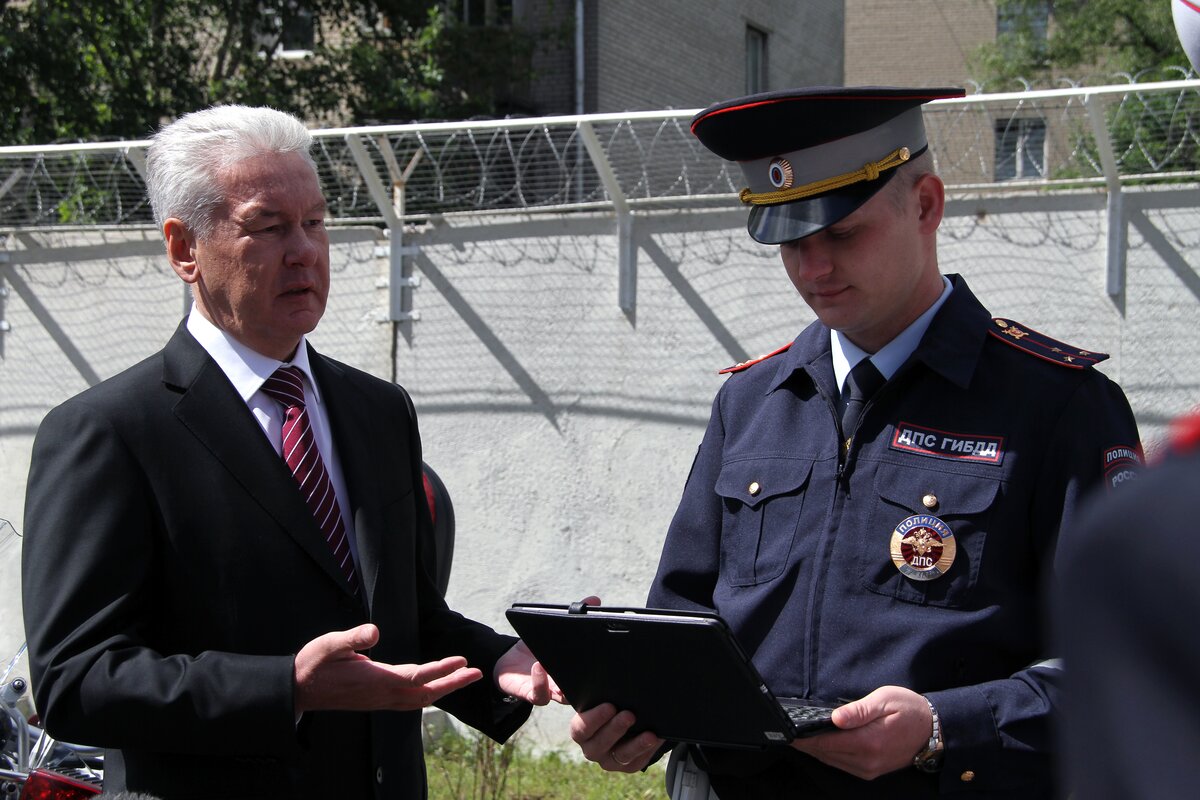 Сергей Собянин и министр внутренних дел Владимир Колокольцев посетили первый батальон второго спецполка УГИБДД Главного управления МВД России по Москве, где ознакомились с работой комплексов "Мобильный инспектор".