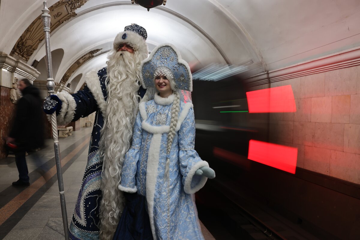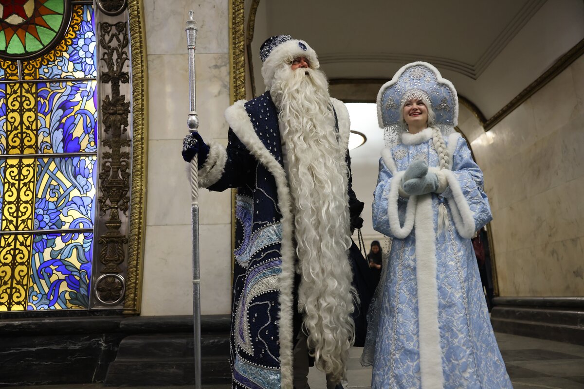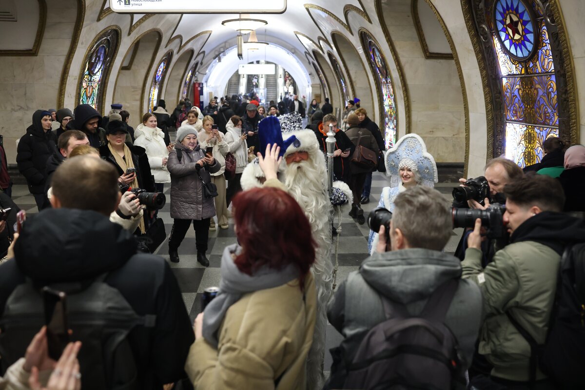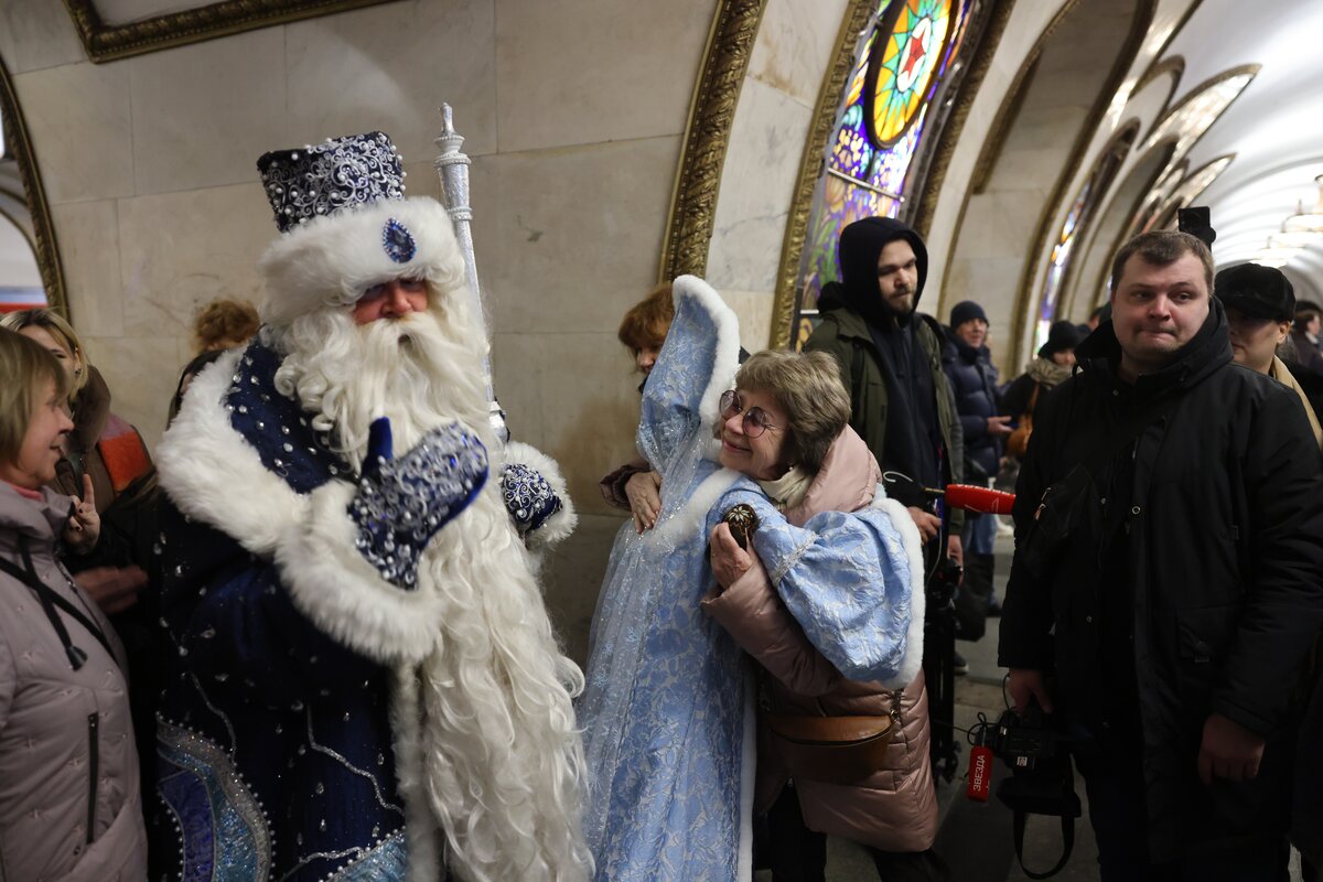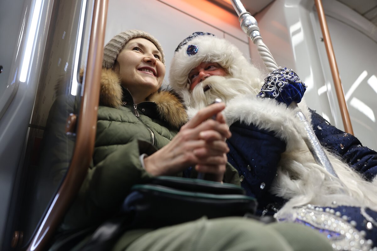 Дед Мороз поздравил с наступающим Новым годом пассажиров Кольцевой линии метро в Москве.