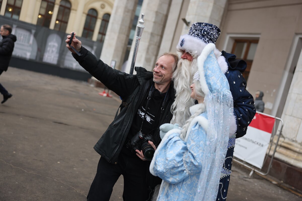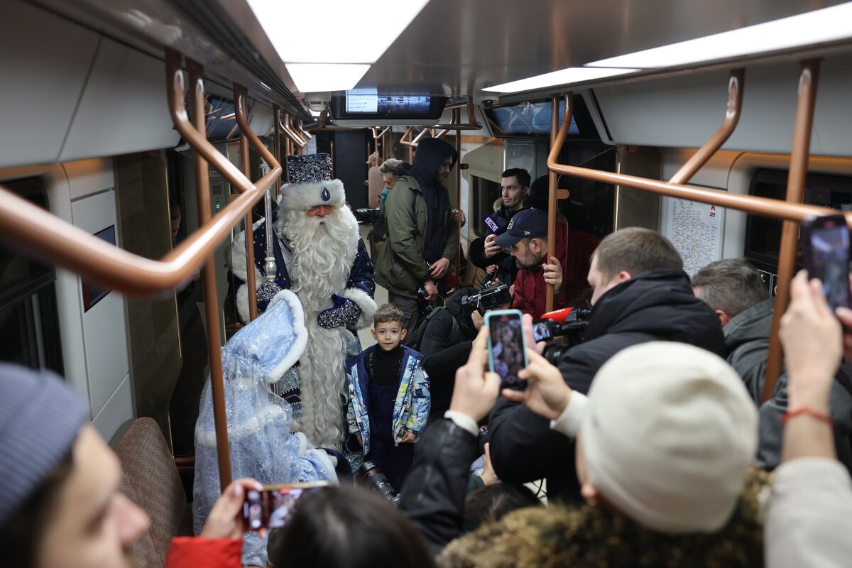 Он оплатил проезд по биометрии на станции метро "Комсомольская", проехал круг по часовой стрелке на Кольцевой линии, подарил новогоднее настроение юным и взрослым пассажирам метро, а под конец раздал свыше 700 елочных игрушек, магнитов, значков, браслетов и конфет.