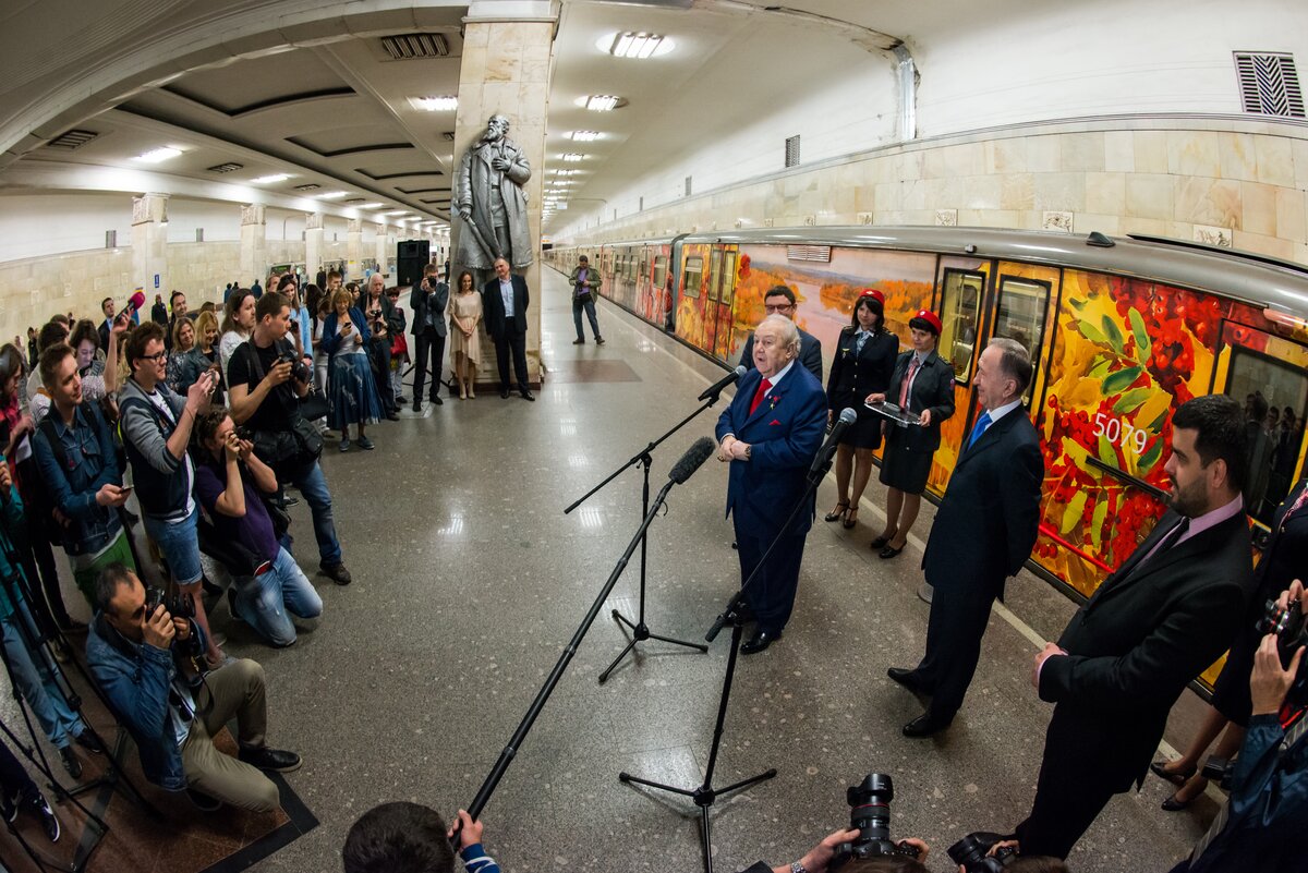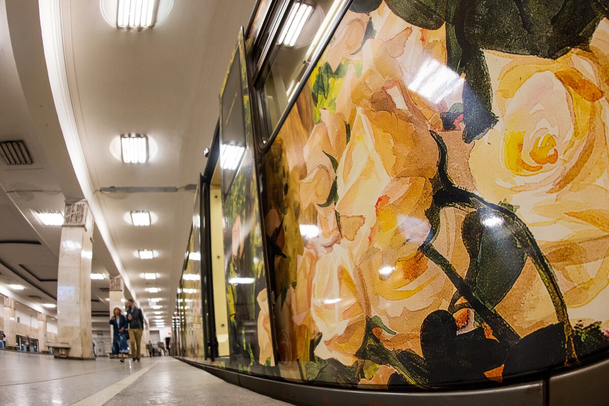 В поезде-картинной галерее "Акварель" открылась новая выставка. Ее представил Музей современного искусства. Состав курсирует по Арбатско-Покровской линии метро с 2007 года.
