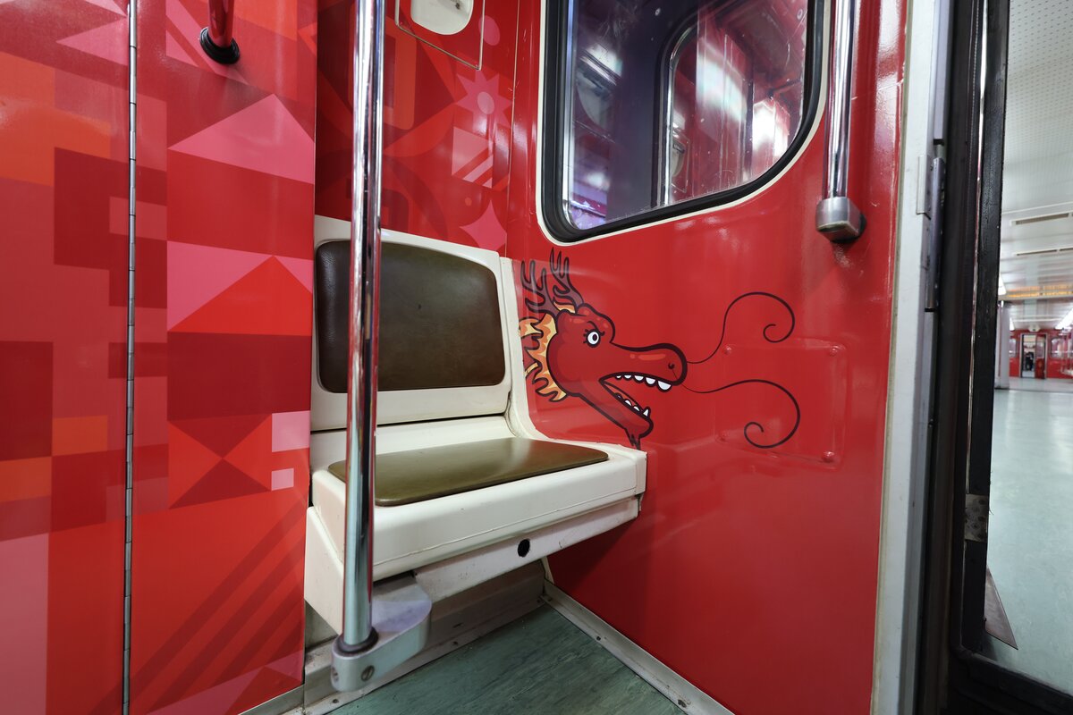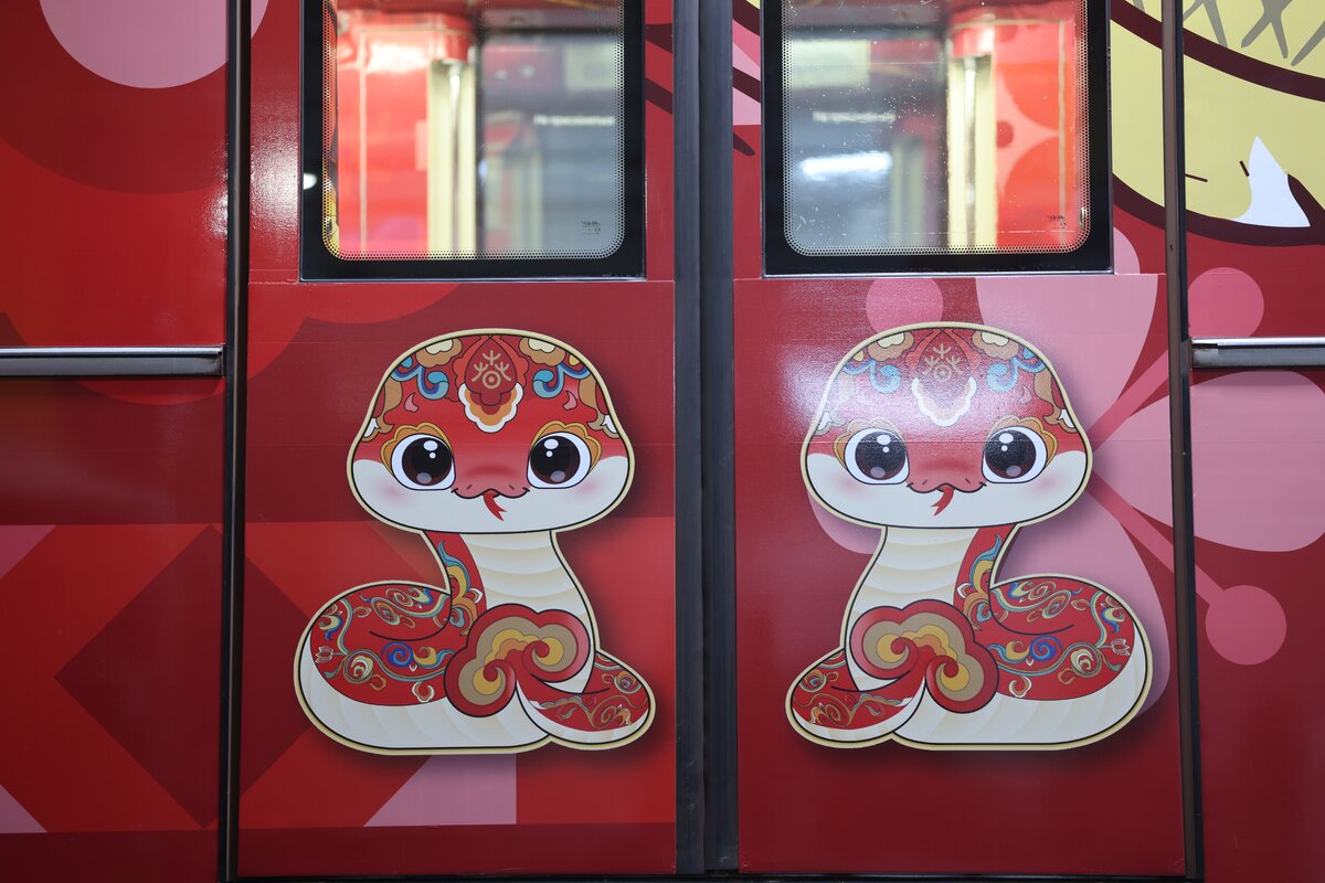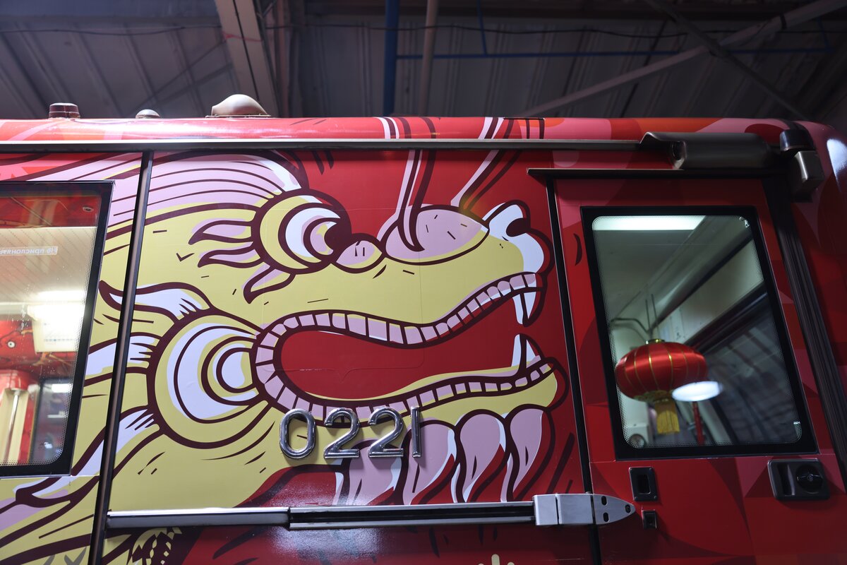 Внешний облик состава выполнен в красных тонах, символизирующих удачу и процветание. В оформлении использованы изображения змеи – символа 2025 года, а также дракона, олицетворяющего доброе начало. Внутри поезда пассажиры увидели кадры празднования Нового года в Китае.