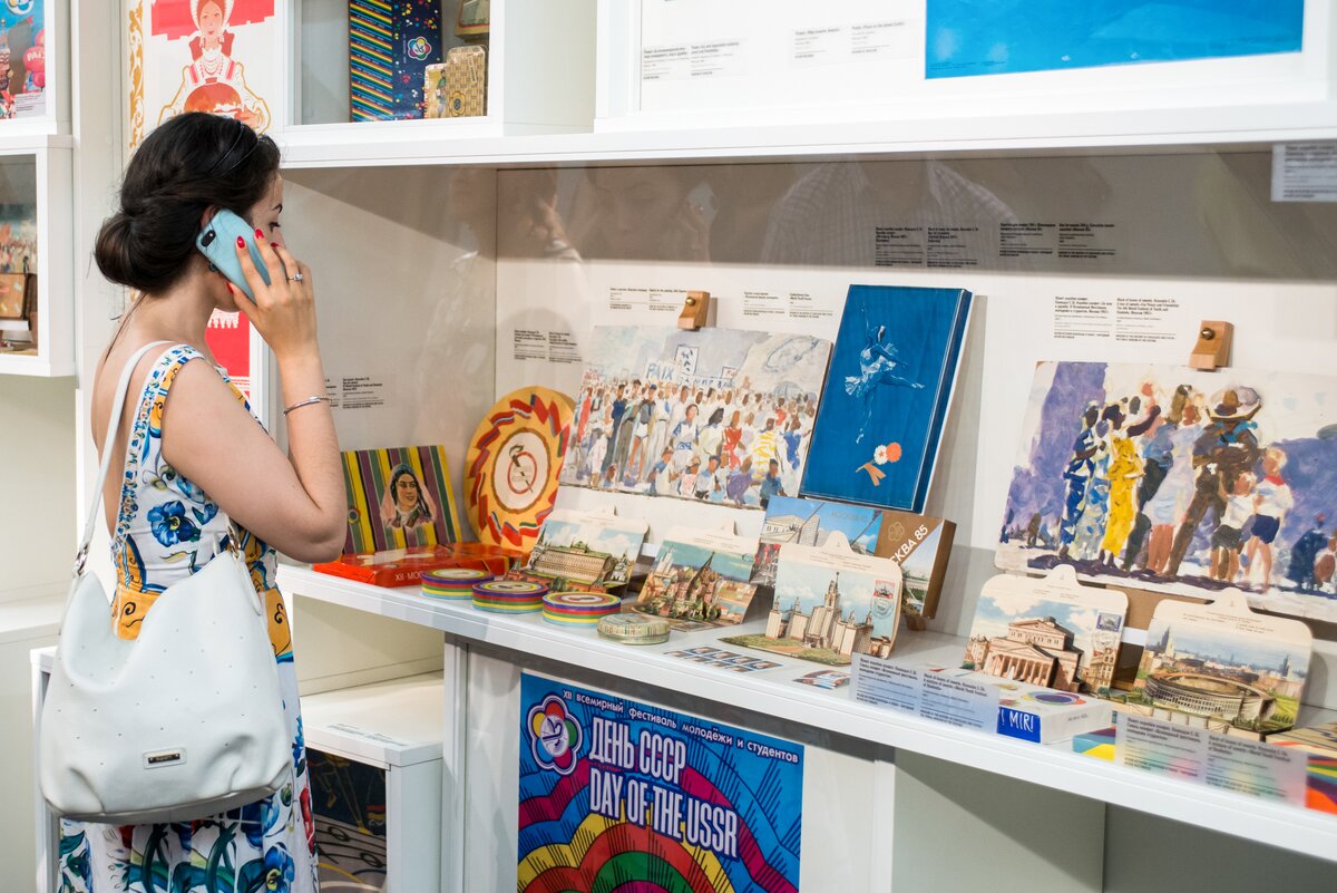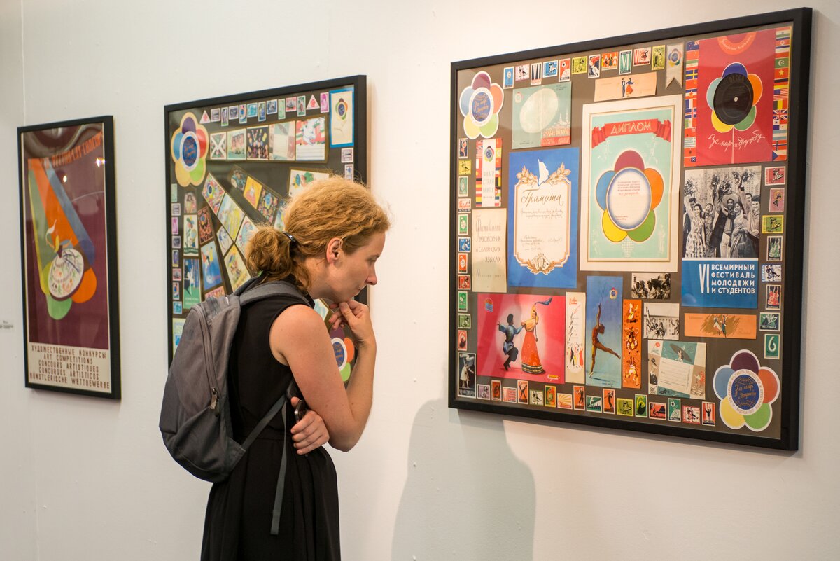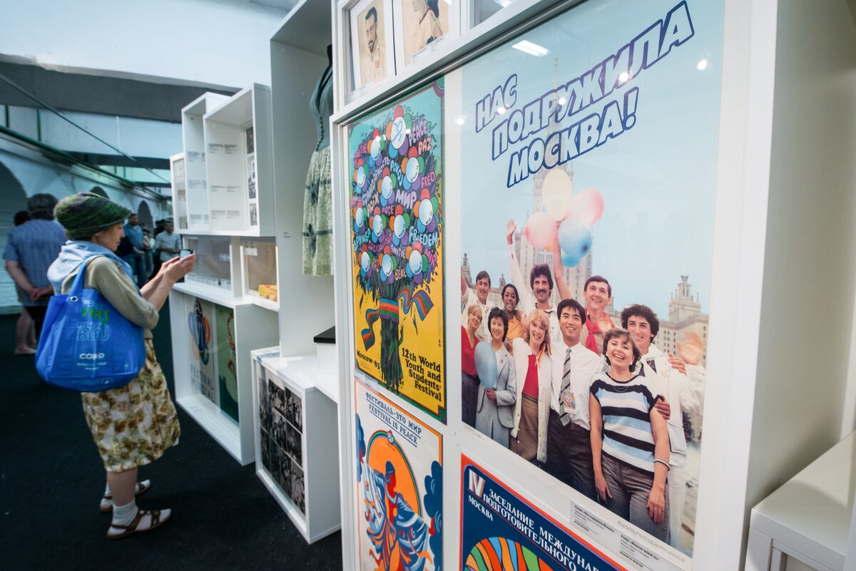 Коллекцию для выставки помогли собрать москвичи и жители других городов: они принесли памятные вещи с символикой фестиваля прошлых лет из своих личных архивов.