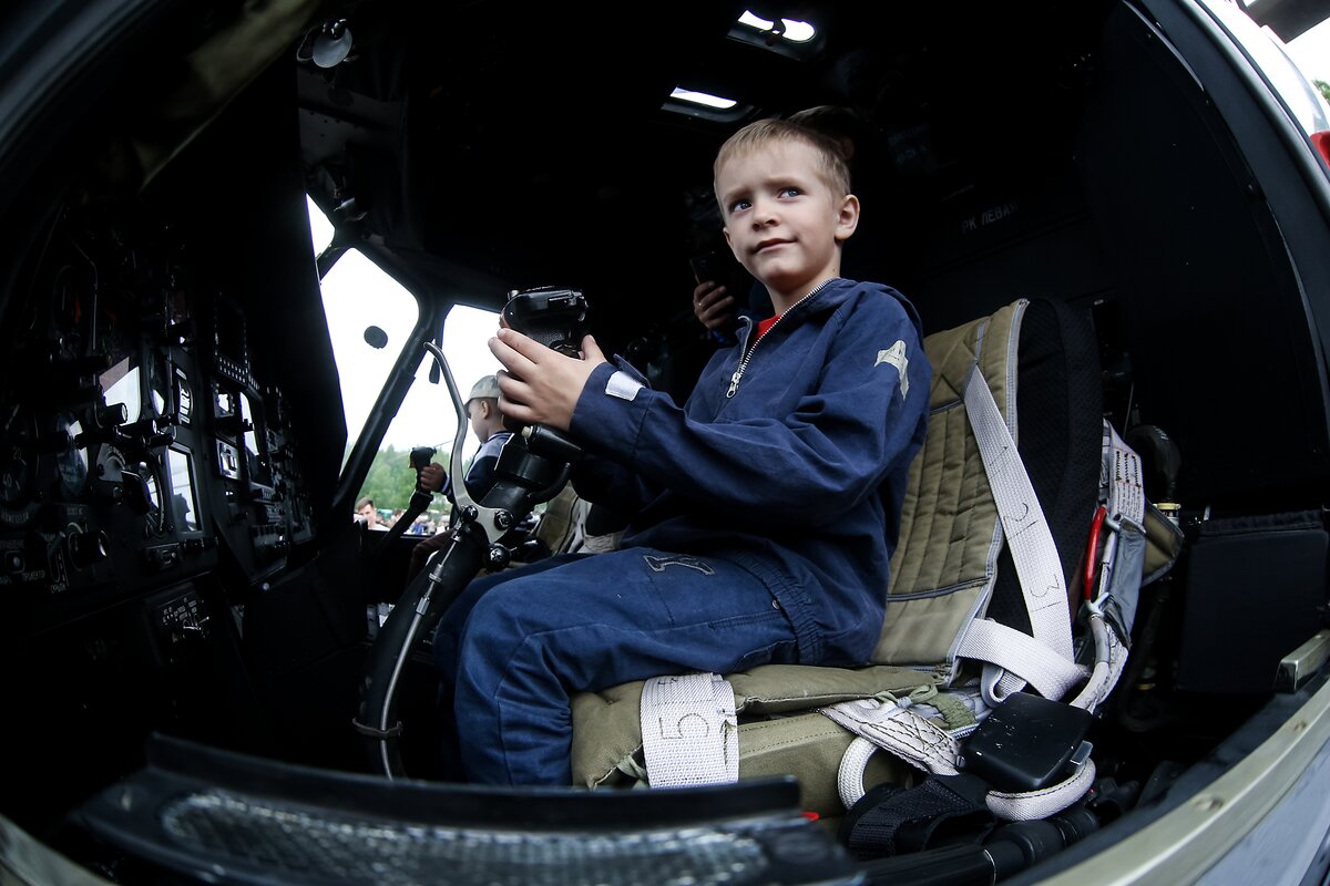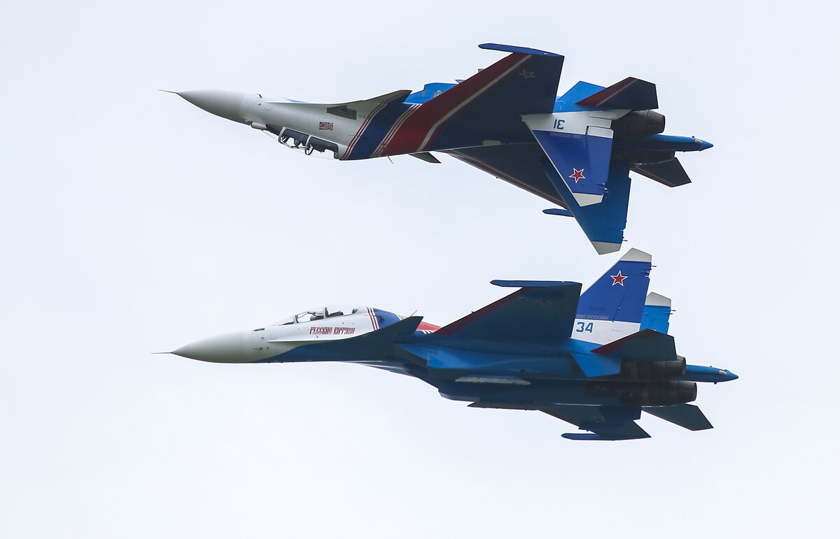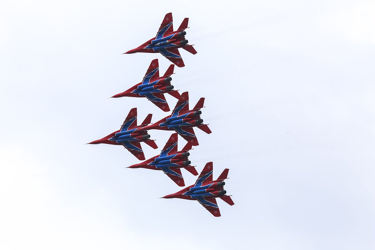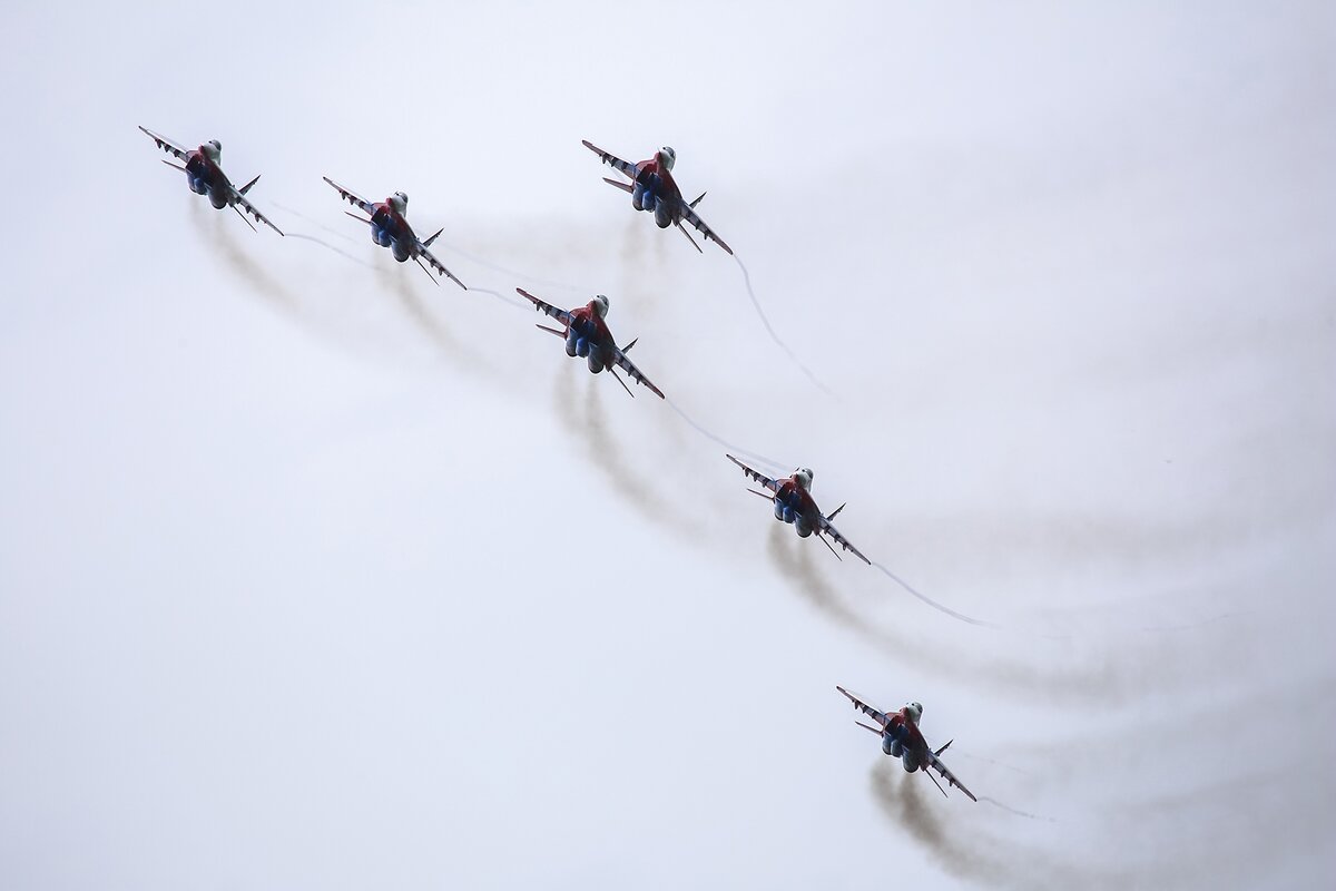 Гостям показали выступления пилотажных групп "Русские витязи" на истребителях Су-30СМ, "Стрижи" на истребителях МиГ-29, "Беркуты" на вертолетах Ми-28Н.